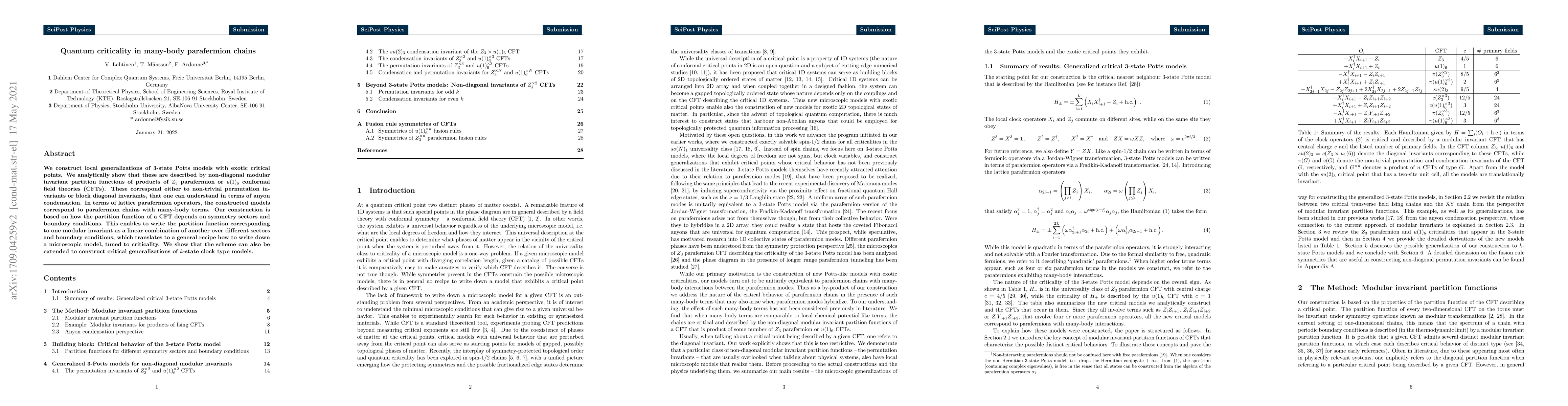 This paper constructs local generalizations of 3-state Potts models leading to exotic critical points described by non-diagonal modular invariant partition functions of $Z_3$ parafermion or $u(1)_6$ CFTs. The models are shown to correspond to many-body parafermion chains and are constructed based on the dependence of CFT partition functions on symmetry sectors and boundary conditions.