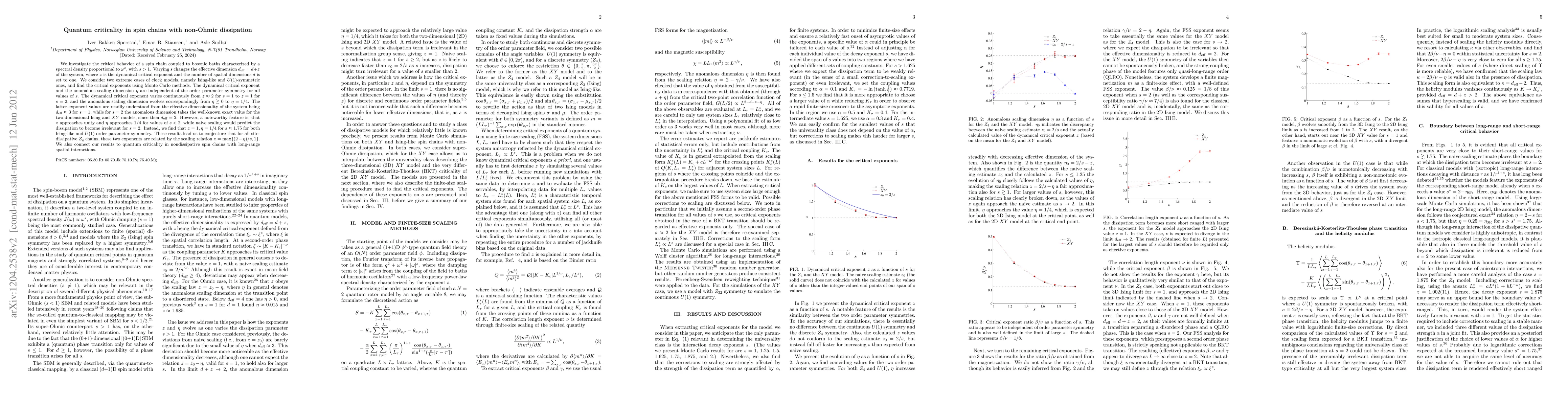 Research explores how dissipation in spin chains affects quantum criticality, finding that dynamic critical exponent z and anomalous scaling dimension η vary with non-ohmic dissipation parameters, contradicting naive expectations.