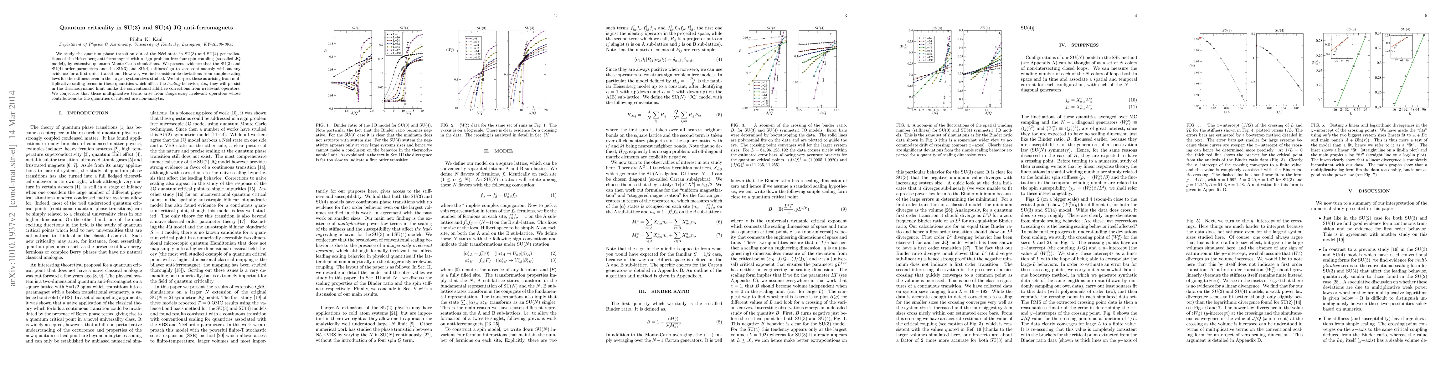 We study the quantum phase transition out of the Neel state in SU(3) and SU(4) generalizations of the Heisenberg anti-ferromagnet with a sign problem free four spin coupling (so-called JQ model), by extensive quantum Monte Carlo simulations. We present evidence that the SU(3) and SU(4) order parameters and the SU(3) and SU(4) stiffness' go to zero continuously without any evidence for a first order transition. However, we find considerable deviations from simple scaling laws for the stiffness even in the largest system sizes studied. We interpret these as arising from multiplicative scaling terms in these quantities which affect the leading behavior, i.e., they will persist in the thermodynamic limit unlike the conventional additive corrections from irrelevant operators. We conjecture that these multiplicative terms arise from dangerously irrelevant operators whose contributions to the quantities of interest are non-analytic.