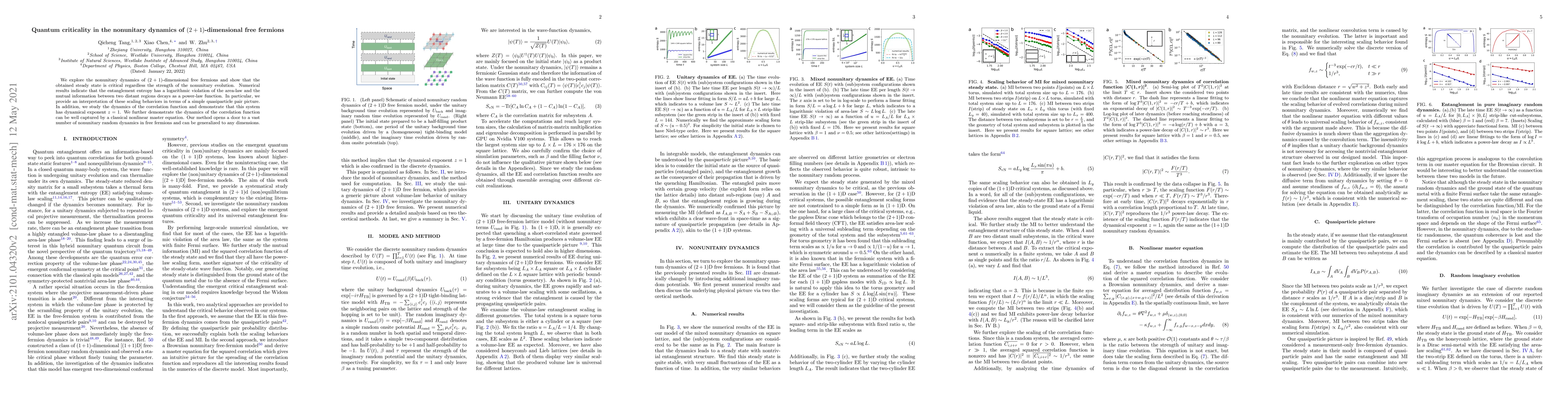 This paper investigates the nonunitary dynamics of $(2+1)$-dimensional free fermions, revealing a critical steady state irrespective of the nonunitary evolution strength. The study finds logarithmic violations of the entanglement entropy area-law and power-law decay in mutual information between distant regions, interpreted via a quasiparticle pair model.