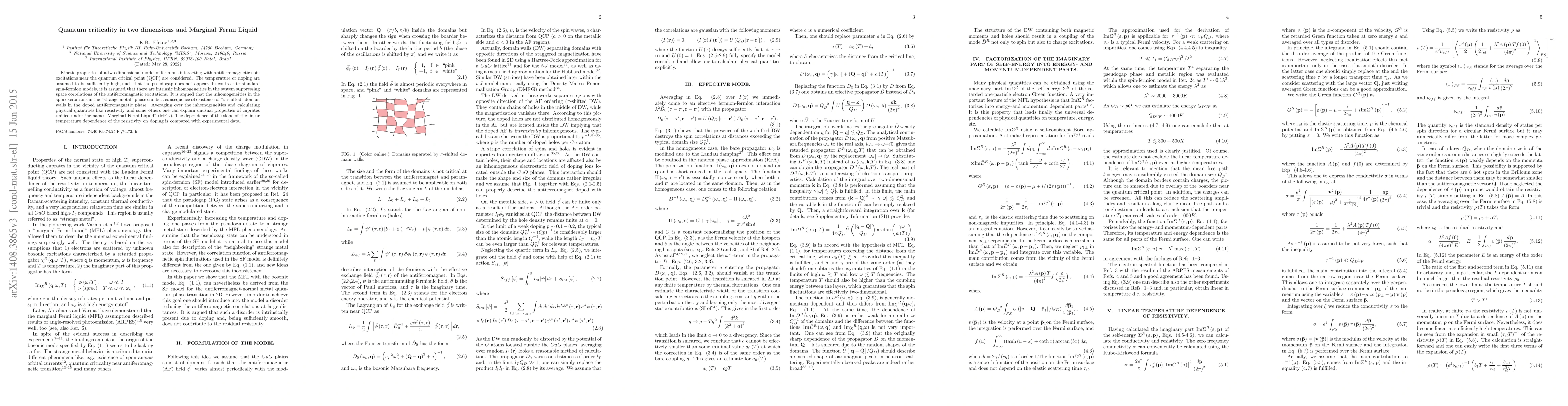 Kinetic properties of a two dimensional model of fermions interacting with antiferromagnetic spin excitations near the quantum critical point (QCP) are considered. The temperature or doping are assumed to be sufficiently high, such that the pseudogap does not appear. In contrast to standard spin-fermion models, it is assumed that there are intrinsic inhomogeneities in the system suppressing space correlations of the antiferromagnetic excitations. It is argued that the inhomogeneities in the spin excitations in the "strange metal" phase can be a consequence of existence of $\pi $-shifted domain walls in the doped antiferromagnetic phase. Averaging over the inhomogeneities and calculating physical quantities like resistivity and some others one can explain unusual properties of cuprates unified under the name "Marginal Fermi Liquid" (MFL). The dependence of the slope of the linear temperature dependence of the resistivity on doping is compared with experimental data.