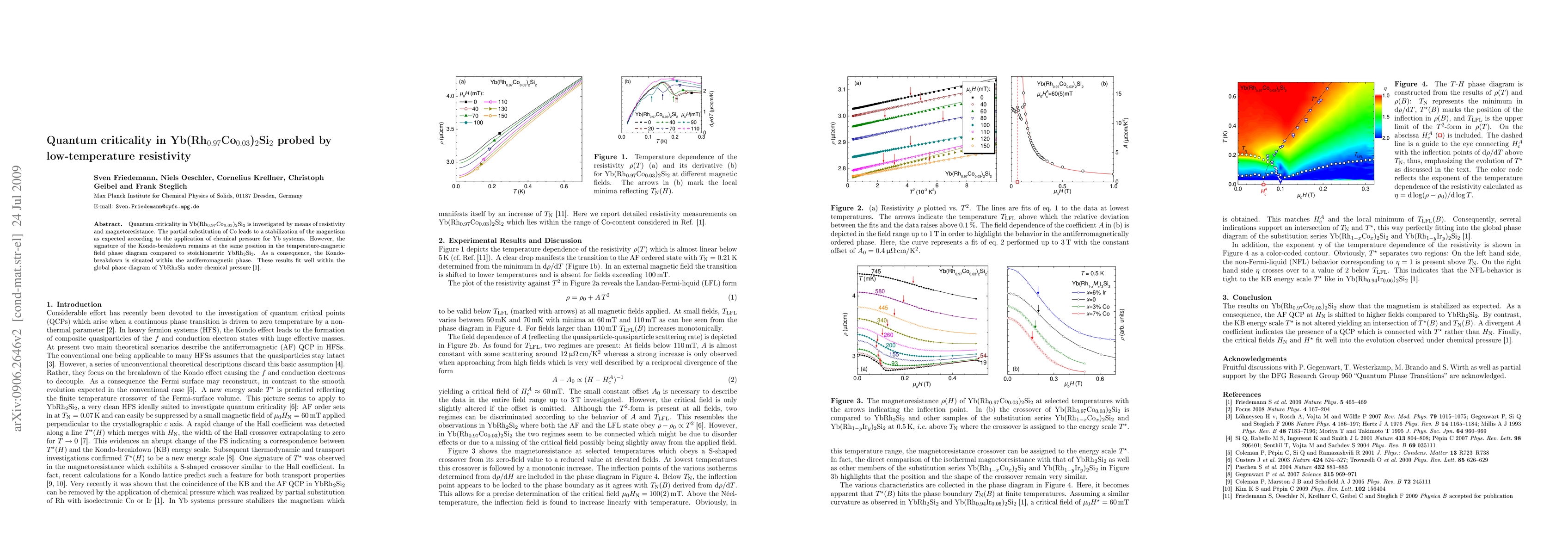 This study investigates quantum criticality in Yb(Rh0.97Co0.03)2Si2 through resistivity and magnetoresistance measurements. The substitution of Co stabilizes magnetism but does not shift the Kondo-breakdown signature, indicating it remains within the antiferromagnetic phase.