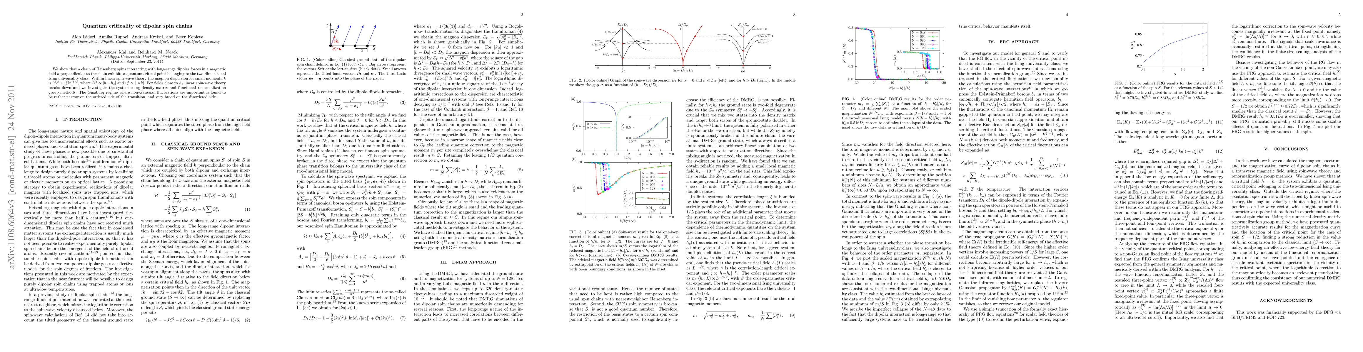 We show that a chain of Heisenberg spins interacting with long-range dipolar forces in a magnetic field h perpendicular to the chain exhibits a quantum critical point belonging to the two-dimensional Ising universality class. Within linear spin-wave theory the magnon dispersion for small momenta k is [Delta^2 + v_k^2 k^2]^{1/2}, where Delta^2 \propto |h - h_c| and v_k^2 \propto |ln k|. For fields close to h_c linear spin-wave theory breaks down and we investigate the system using density-matrix and functional renormalization group methods. The Ginzburg regime where non-Gaussian fluctuations are important is found to be rather narrow on the ordered side of the transition, and very broad on the disordered side.
