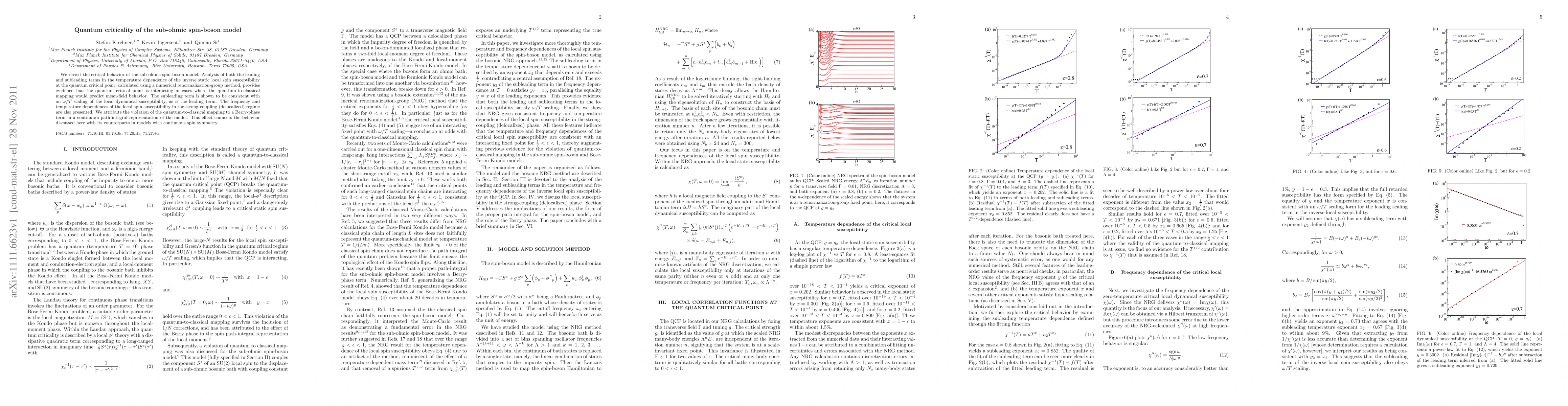We revisit the critical behavior of the sub-ohmic spin-boson model. Analysis of both the leading and subleading terms in the temperature dependence of the inverse static local spin susceptibility at the quantum critical point, calculated using a numerical renormalization-group method, provides evidence that the quantum critical point is interacting in cases where the quantum-to-classical mapping would predict mean-field behavior. The subleading term is shown to be consistent with an w/T scaling of the local dynamical susceptibility, as is the leading term. The frequency and temperature dependences of the local spin susceptibility in the strong-coupling (delocalized) regime are also presented. We attribute the violation of the quantum-to-classical mapping to a Berry-phase term in a continuum path-integral representation of the model. This effect connects the behavior discussed here with its counterparts in models with continuous spin symmetry.