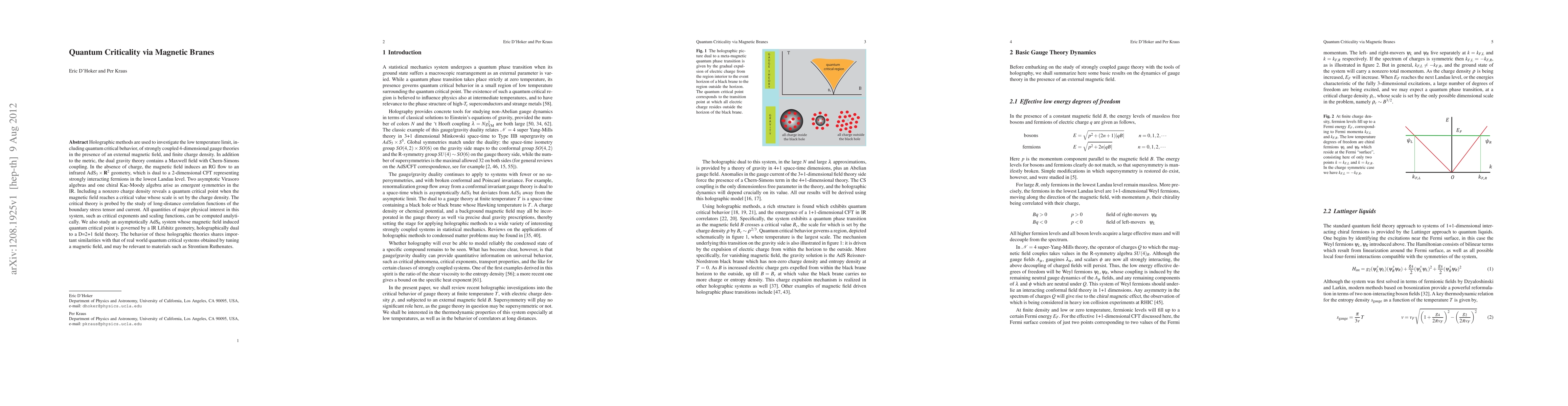 Holographic methods are used to investigate the low temperature limit, including quantum critical behavior, of strongly coupled 4-dimensional gauge theories in the presence of an external magnetic field, and finite charge density. In addition to the metric, the dual gravity theory contains a Maxwell field with Chern-Simons coupling. In the absence of charge, the magnetic field induces an RG flow to an infrared AdS$_3 \times {\bf R}^2$ geometry, which is dual to a 2-dimensional CFT representing strongly interacting fermions in the lowest Landau level. Two asymptotic Virasoro algebras and one chiral Kac-Moody algebra arise as {\sl emergent symmetries} in the IR. Including a nonzero charge density reveals a quantum critical point when the magnetic field reaches a critical value whose scale is set by the charge density. The critical theory is probed by the study of long-distance correlation functions of the boundary stress tensor and current. All quantities of major physical interest in this system, such as critical exponents and scaling functions, can be computed analytically. We also study an asymptotically AdS$_6$ system whose magnetic field induced quantum critical point is governed by a IR Lifshitz geometry, holographically dual to a D=2+1 field theory. The behavior of these holographic theories shares important similarities with that of real world quantum critical systems obtained by tuning a magnetic field, and may be relevant to materials such as Strontium Ruthenates.