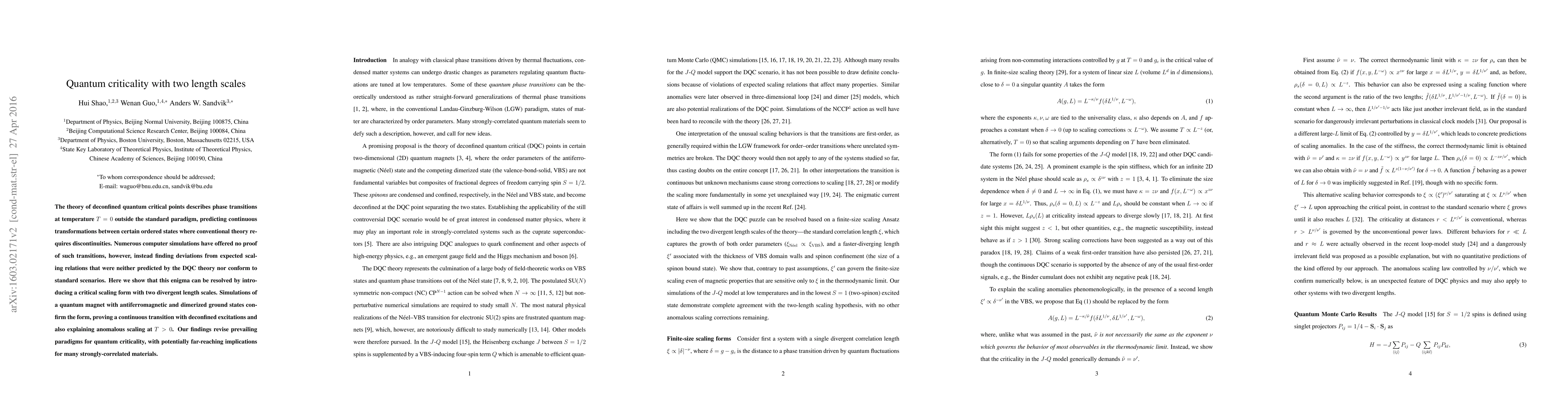 The theory of deconfined quantum critical points describes phase transitions at temperature T = 0 outside the standard paradigm, predicting continuous transformations between certain ordered states where conventional theory requires discontinuities. Numerous computer simulations have offered no proof of such transitions, however, instead finding deviations from expected scaling relations that were neither predicted by the DQC theory nor conform to standard scenarios. Here we show that this enigma can be resolved by introducing a critical scaling form with two divergent length scales. Simulations of a quantum magnet with antiferromagnetic and dimerized ground states confirm the form, proving a continuous transition with deconfined excitations and also explaining anomalous scaling at T > 0. Our findings revise prevailing paradigms for quantum criticality, with potentially far-reaching implications for many strongly-correlated materials.