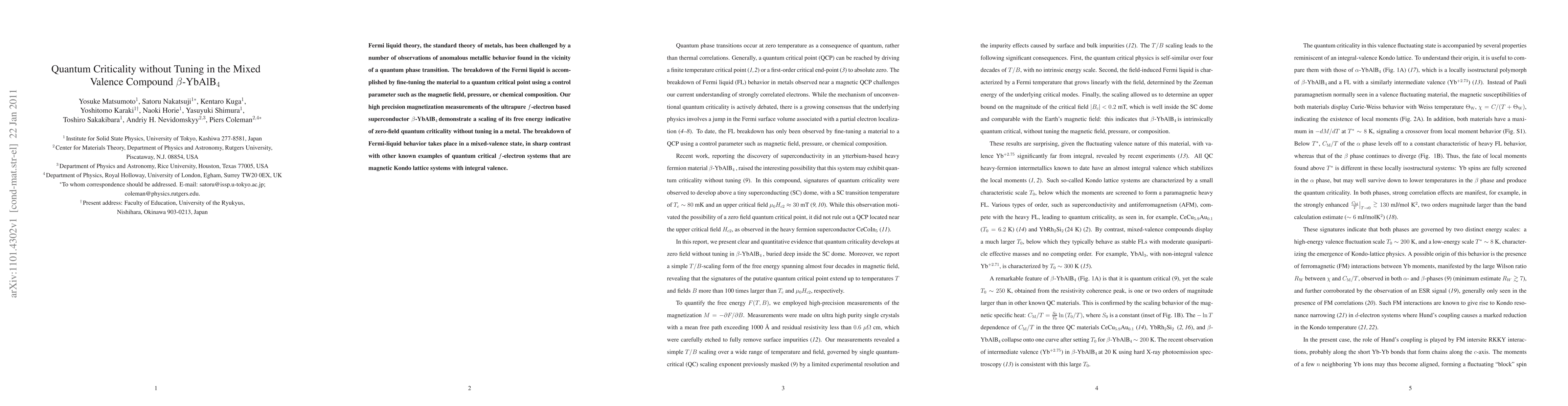 Fermi liquid theory, the standard theory of metals, has been challenged by a number of observations of anomalous metallic behavior found in the vicinity of a quantum phase transition. The breakdown of the Fermi liquid is accomplished by fine-tuning the material to a quantum critical point using a control parameter such as the magnetic field, pressure, or chemical composition. Our high precision magnetization measurements of the ultrapure f-electron based superconductor {\beta}-YbAlB4 demonstrate a scaling of its free energy indicative of zero-field quantum criticality without tuning in a metal. The breakdown of Fermi-liquid behavior takes place in a mixed-valence state, in sharp contrast with other known examples of quantum critical f-electron systems that are magnetic Kondo lattice systems with integral valence.