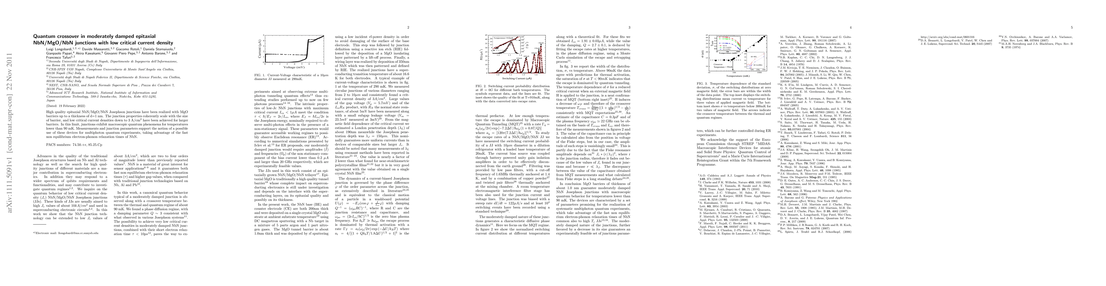 This paper reports on the fabrication of high-quality epitaxial NbN/MgO/NbN Josephson junctions with low critical current densities, demonstrating quantum crossover behavior at temperatures below 90 mK. The junctions show potential for multiphoton quantum experiments due to the fast electron-phonon relaxation times in NbN.