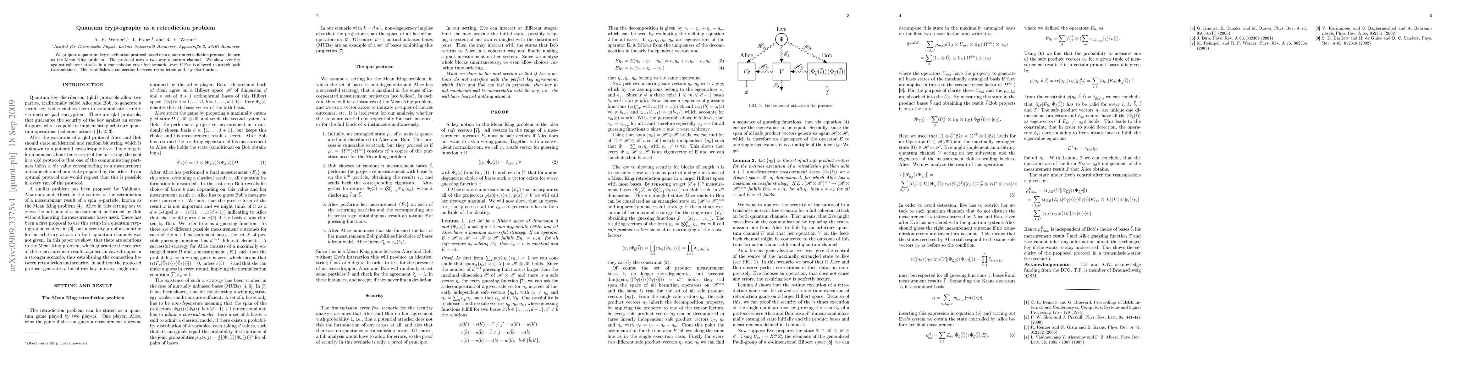 This paper proposes a quantum key distribution protocol based on the Mean King retrodiction problem, utilizing a two-way quantum channel. It demonstrates security against coherent attacks in error-free transmission, establishing a link between quantum retrodiction and secure key distribution.