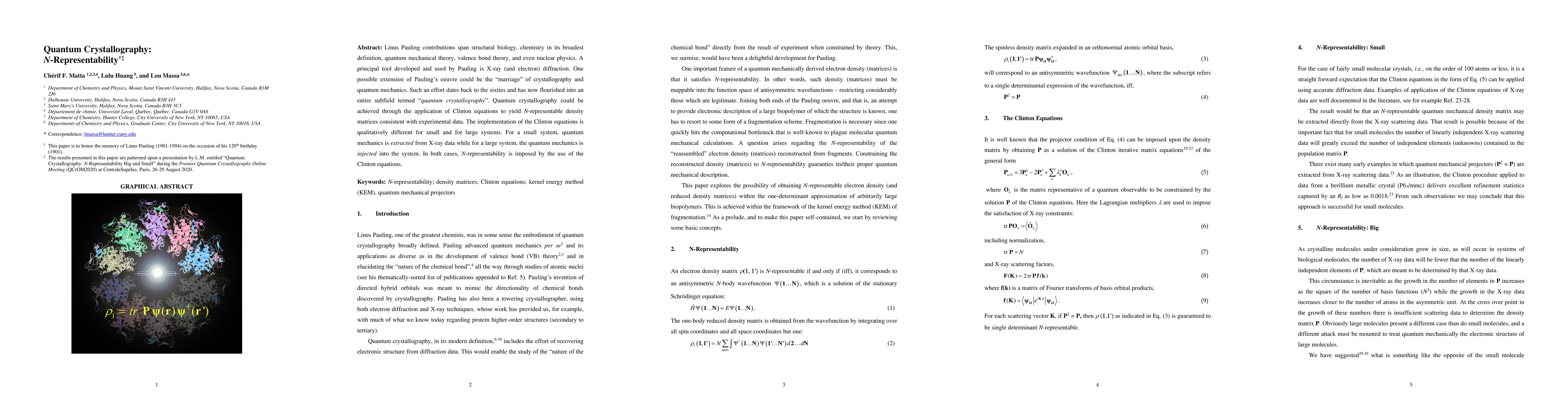 Linus Pauling contributions span structural biology, chemistry in its broadest definition, quantum mechanical theory, valence bond theory, and even nuclear physics. A principal tool developed and used by Pauling is Xray, and electron, diffraction. One possible extension of the Pauling oeuvre could be the marriage of crystallography and quantum mechanics. Such an effort dates back to the sixties and has now flourished into an entire subfield termed quantum crystallography. Quantum crystallography could be achieved through the application of Clinton equations to yield N-representable density matrices consistent with experimental data. The implementation of the Clinton equations is qualitatively different for small and for large systems. For a small system, quantum mechanics is extracted from Xray data while for a large system, the quantum mechanics is injected into the system. In both cases, Nrepresentability is imposed by the use of the Clinton equations.