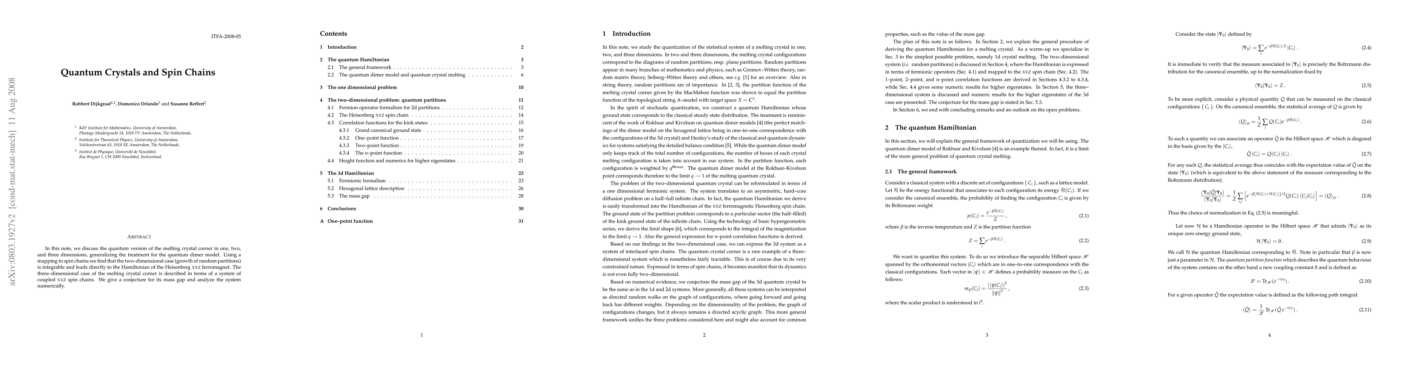 In this note, we discuss the quantum version of the melting crystal corner in one, two, and three dimensions, generalizing the treatment for the quantum dimer model. Using a mapping to spin chains we find that the two--dimensional case (growth of random partitions) is integrable and leads directly to the Hamiltonian of the Heisenberg XXZ ferromagnet. The three--dimensional case of the melting crystal corner is described in terms of a system of coupled XXZ spin chains. We give a conjecture for its mass gap and analyze the system numerically.