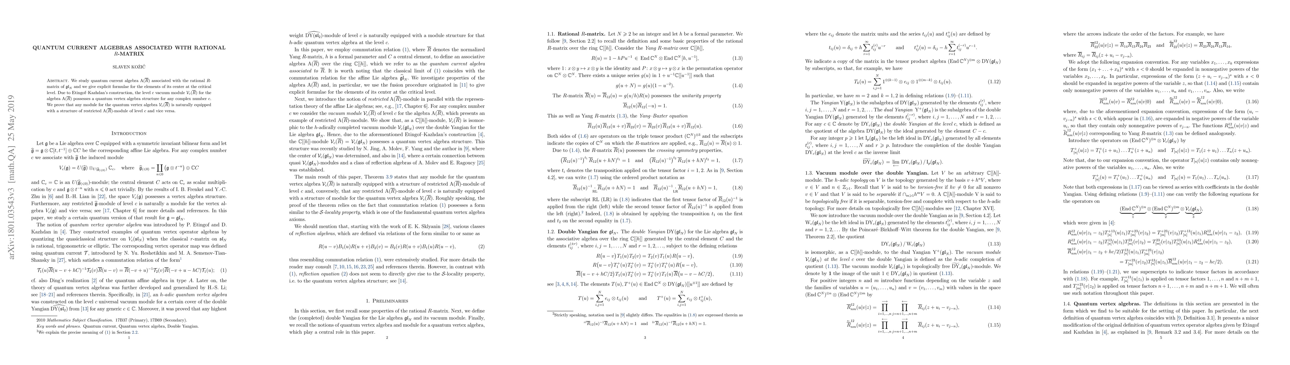 We study quantum current algebra $\textrm{A}(\overline{R})$ associated with the rational $R$-matrix of $\mathfrak{gl}_N$ and we give explicit formulae for the elements of its center at the critical level. Due to Etingof--Kazhdan's construction, the level $c$ vacuum module $\mathcal{V}_c(\overline{R})$ for the algebra $\textrm{A}(\overline{R})$ possesses a quantum vertex algebra structure for any complex number $c$. We prove that any module for the quantum vertex algebra $\mathcal{V}_c(\overline{R})$ is naturally equipped with a structure of restricted $\textrm{A}(\overline{R})$-module of level $c$ and vice versa.