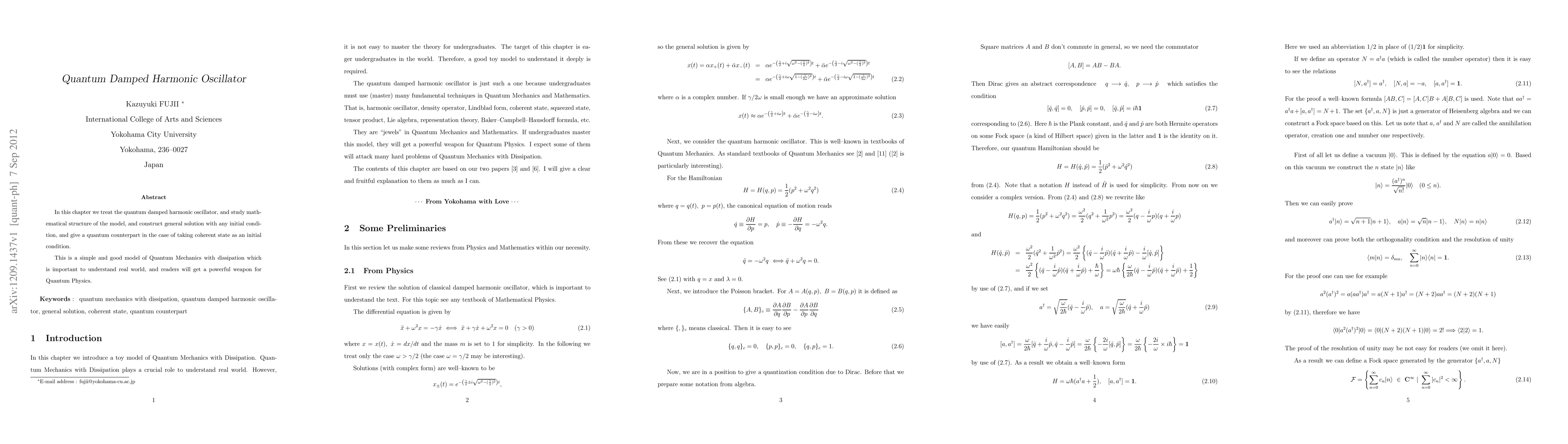 In this chapter we treat the quantum damped harmonic oscillator, and study mathematical structure of the model, and construct general solution with any initial condition, and give a quantum counterpart in the case of taking coherent state as an initial condition. This is a simple and good model of Quantum Mechanics with dissipation which is important to understand real world, and readers will get a powerful weapon for Quantum Physics.