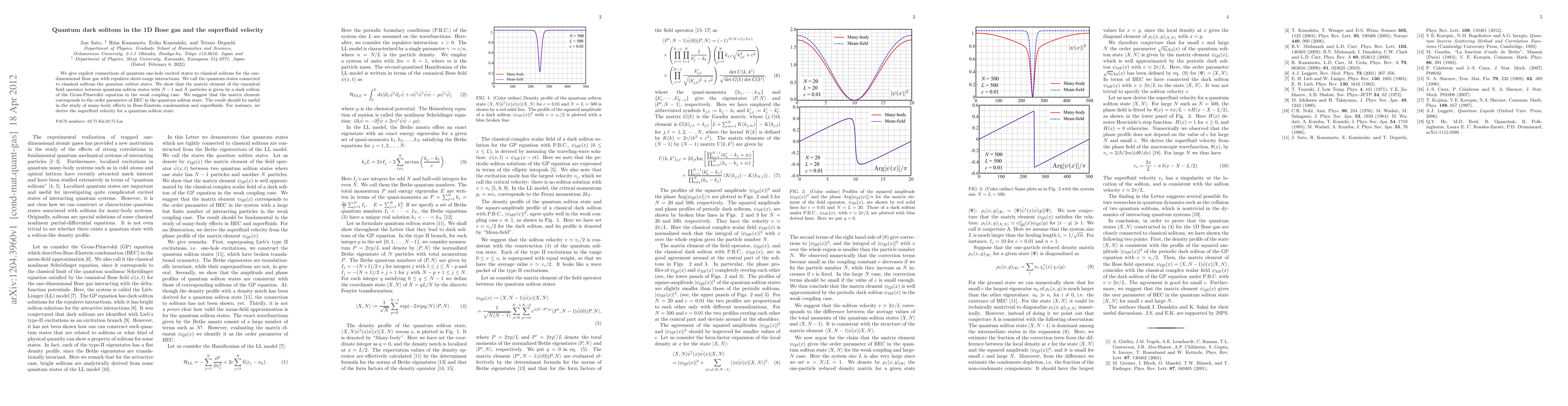 This paper establishes a link between quantum one-hole excited states in a 1D Bose gas and classical solitons, proposing these quantum states as "quantum soliton states." It demonstrates that the matrix element of the canonical field operator between these states corresponds to a dark soliton in the Gross-Pitaevskii equation, suggesting it as an order parameter for Bose-Einstein condensation, and derives the superfluid velocity for such quantum soliton states.