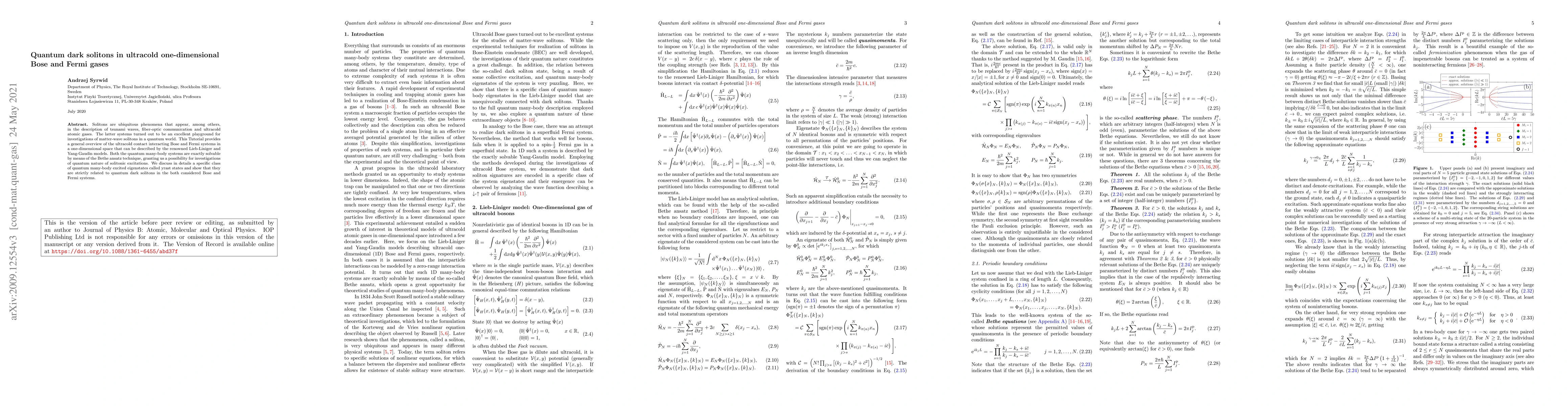 This paper provides an overview of soliton phenomena in ultracold one-dimensional Bose and Fermi gases, described by the Lieb-Liniger and Yang-Gaudin models. It details the quantum nature of solitonic excitations, specifically focusing on the relationship between yrast states and quantum dark solitons in these systems.