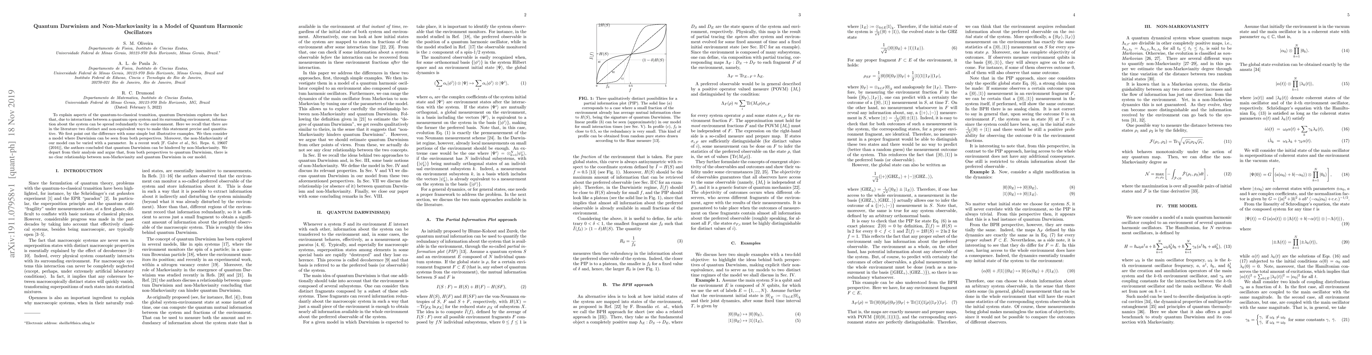 This paper examines quantum Darwinism and non-Markovianity in a quantum harmonic oscillator model, finding no clear relationship between the two despite previous claims. It highlights the distinct quantitative approaches to defining quantum Darwinism and uses illustrative examples to clarify these differences.