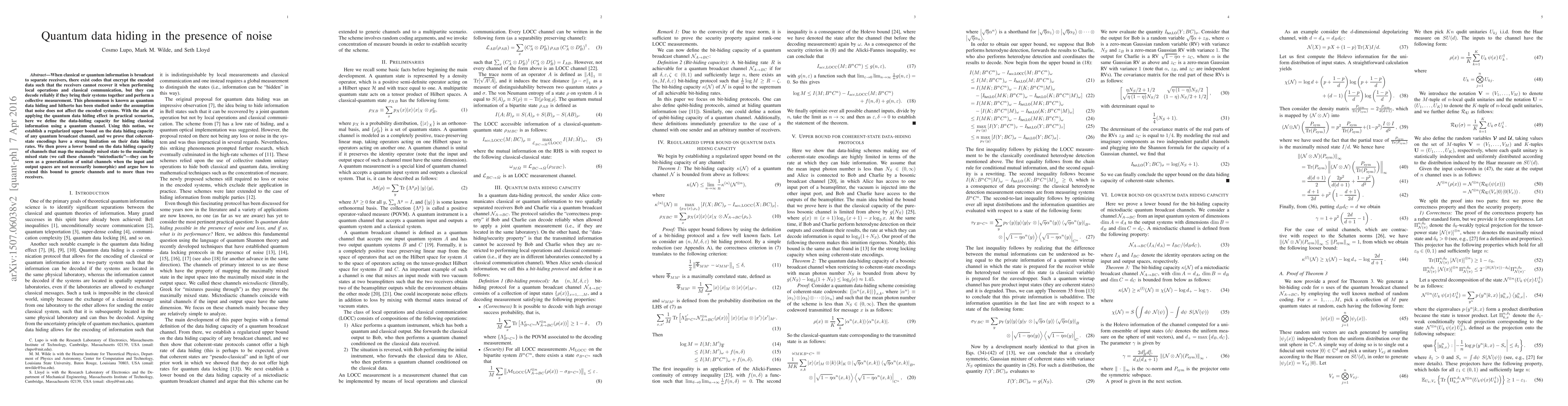 This paper investigates quantum data hiding in the presence of noise, establishing a regularized upper bound on the data hiding capacity for quantum channels. It also proves a lower bound for "mictodiactic" channels and discusses limitations of coherent-state encodings, aiming to apply quantum data hiding in practical scenarios.