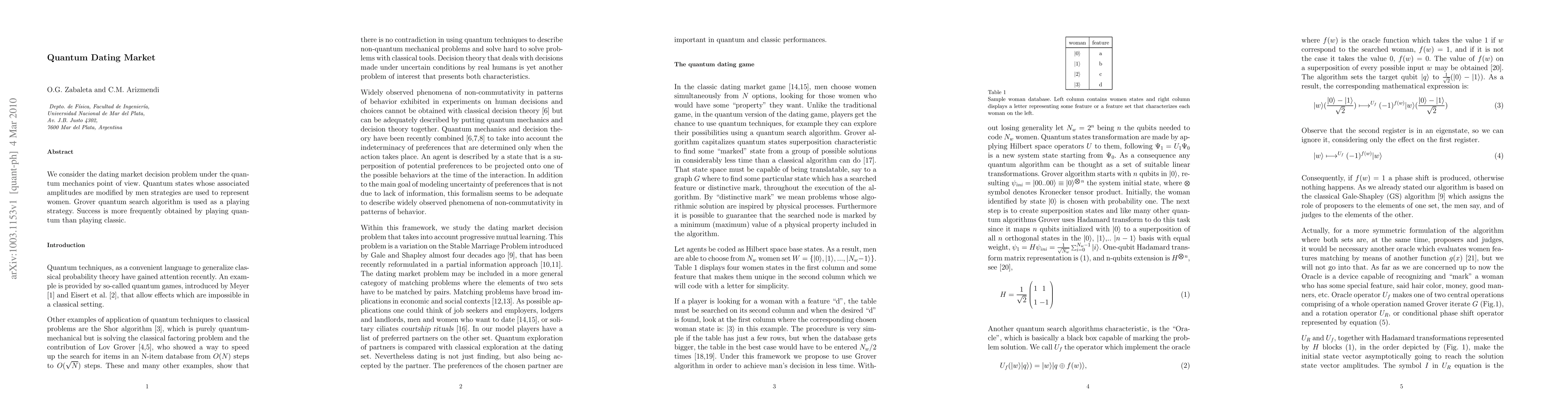 We consider the dating market decision problem under the quantum mechanics point of view. Quantum states whose associated amplitudes are modified by men strategies are used to represent women. Grover quantum search algorithm is used as a playing strategy. Success is more frequently obtained by playing quantum than playing classic.