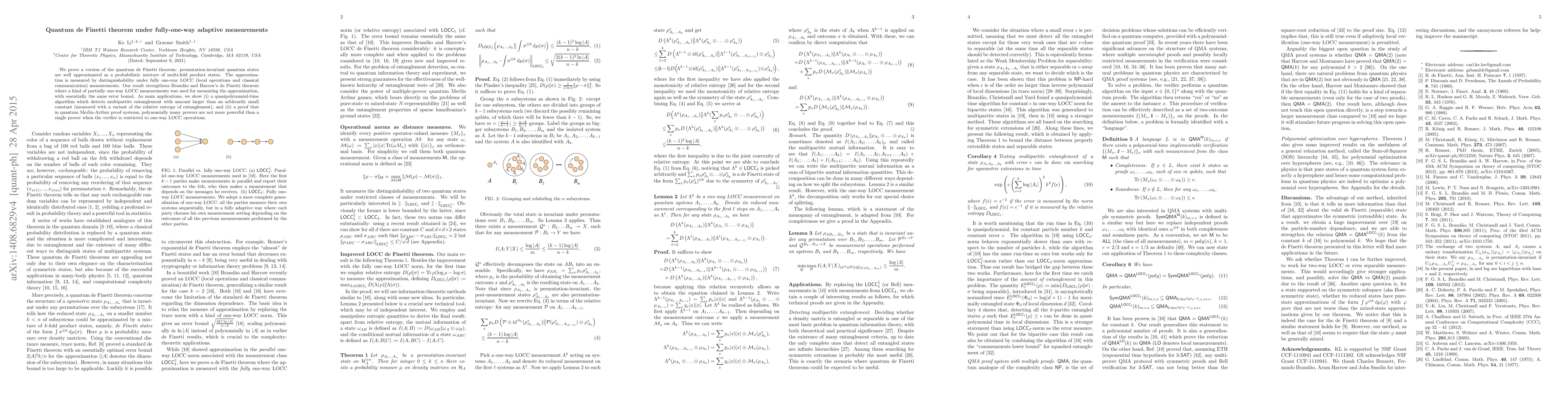 This paper proves a quantum de Finetti theorem under fully one-way adaptive measurements, showing that permutation-invariant quantum states can be approximated by product states. It also provides a quasipolynomial-time algorithm for detecting significant multipartite entanglement and proves that multiple provers are not more powerful than a single prover in quantum Merlin-Arthur proof systems under one-way LOCC operations.