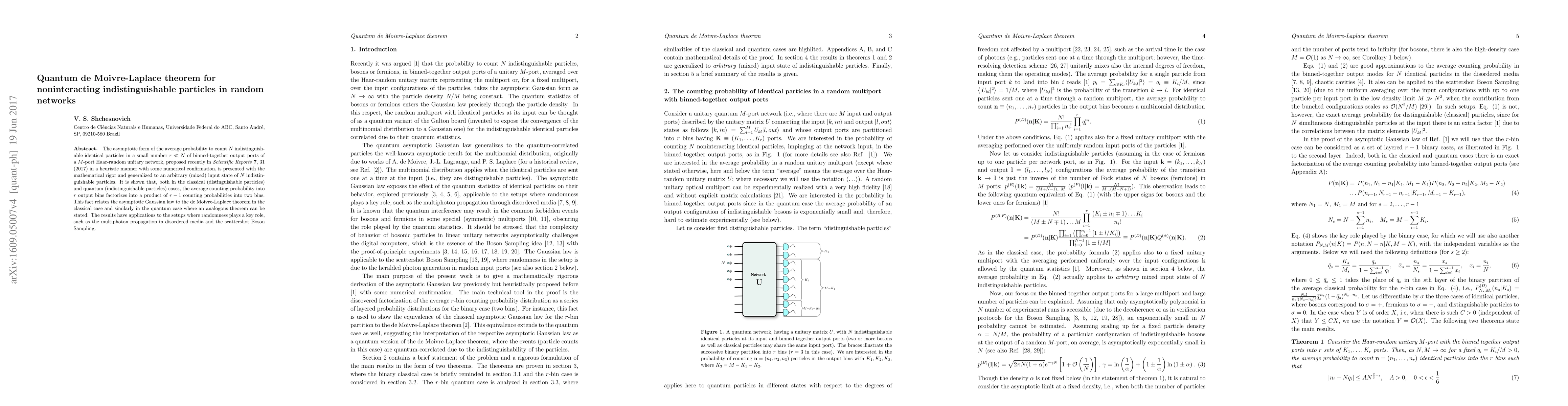 The paper proves a de Moivre-Laplace theorem for indistinguishable particles in quantum systems, showing that average probability factorizes into product of probabilities into two bins, similar to classical case.