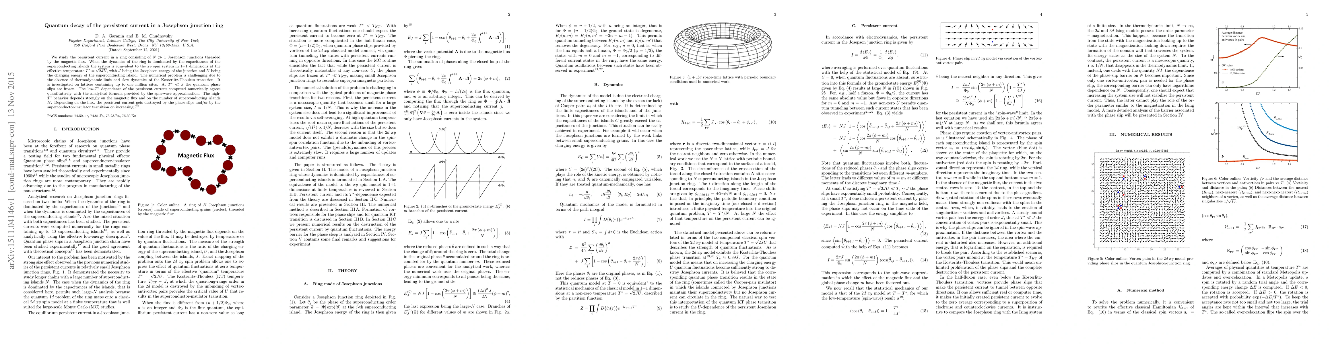 We study the persistent current in a ring consisting of N >> 1 Josephson junctions threaded by the magnetic flux. When the dynamics of the ring is dominated by the capacitances of the superconducting islands the system is equivalent to the xy spin system in 1+1 dimensions at the effective temperature T*=(2JU)^(1/2), with J being the Josephson energy of the junction and U being the charging energy of the superconducting island. The numerical problem is challenging due to the absence of thermodynamic limit and slow dynamics of the Kosterlitz-Thouless transition. It is investigated on lattices containing up to one million sites. At T << J the quantum phase slips are frozen. The low-T* dependence of the persistent current computed numerically agrees quantitatively with the analytical formula provided by the spin-wave approximation. The high- T* behavior depends strongly on the magnetic flux and on the number of superconducting islands N. Depending on the flux, the persistent current gets destroyed by the phase slips and/or by the superconductor-insulator transition on increasing T*.