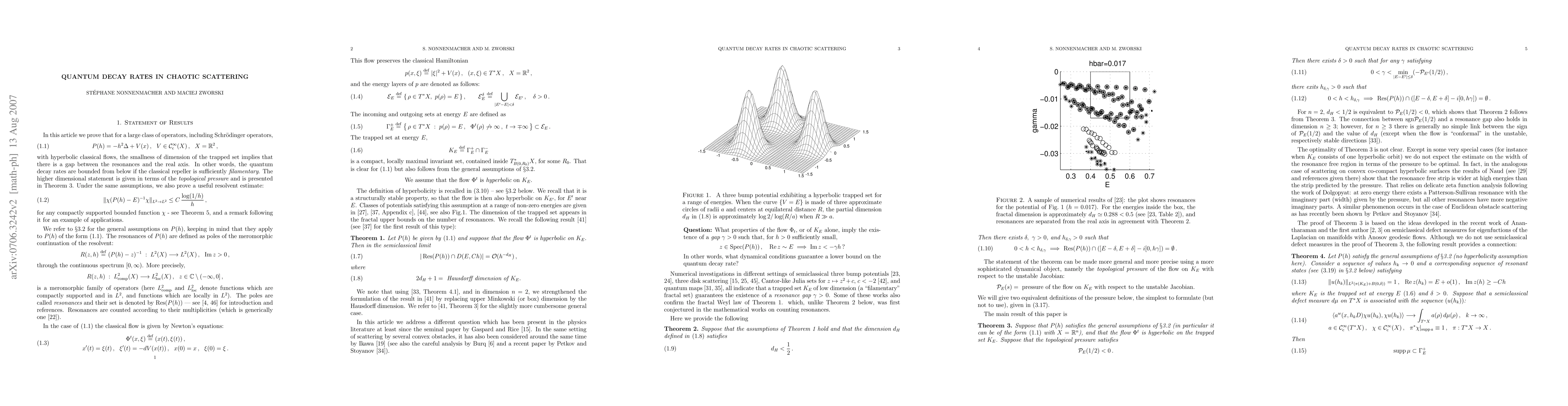 In this article we prove that for a large class of operators, including Schroedinger operators, with hyperbolic classical flows, the smallness of dimension of the trapped set implies that there is a gap between the resonances and the real axis. In other words, the quantum decay rate is bounded from below if the classical repeller is sufficiently filamentary. The higher dimensional statement is given in terms of the topological pressure. Under the same assumptions we also prove a resolvent estimate with a logarithmic loss compared to nontrapping estimates.