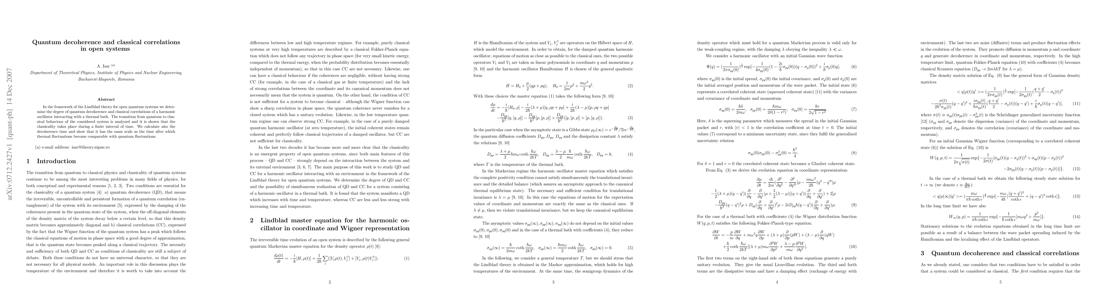 This paper investigates quantum decoherence and classical correlations in a harmonic oscillator interacting with a thermal bath using the Lindblad theory. It demonstrates that the transition from quantum to classical behavior occurs over a finite time interval, with the decoherence time scaling with the time when thermal fluctuations match quantum fluctuations.