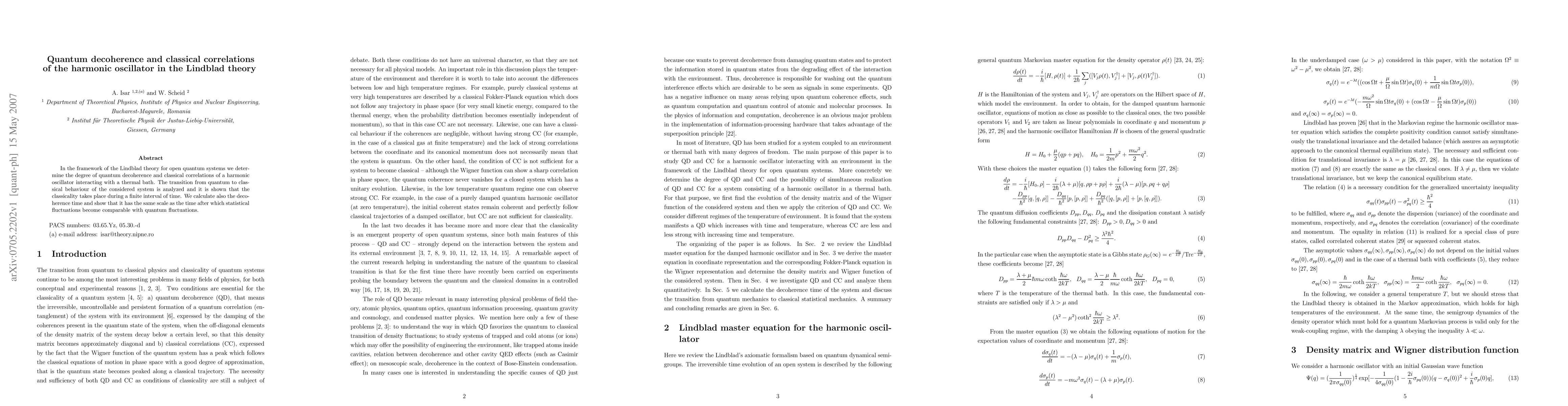 This paper investigates the quantum decoherence and classical correlations in a harmonic oscillator interacting with a thermal bath using the Lindblad theory. It demonstrates that the transition from quantum to classical behavior occurs within a finite time interval, and calculates the decoherence time, which aligns with the time when statistical fluctuations match quantum fluctuations.