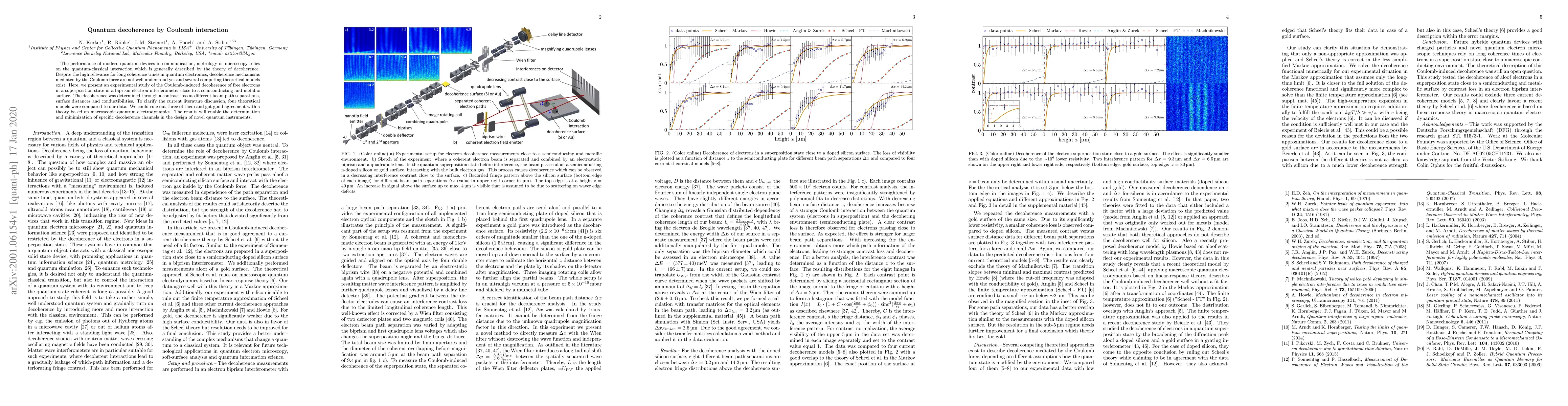 The performance of modern quantum devices in communication, metrology or microscopy relies on the quantum-classical interaction which is generally described by the theory of decoherence. Despite the high relevance for long coherence times in quantum electronics, decoherence mechanisms mediated by the Coulomb force are not well understood yet and several competing theoretical models exist. Here, we present an experimental study of the Coulomb-induced decoherence of free electrons in a superposition state in a biprism electron interferometer close to a semiconducting and metallic surface. The decoherence was determined through a contrast loss at different beam path separations, surface distances and conductibilities. To clarify the current literature discussion, four theoretical models were compared to our data. We could rule out three of them and got good agreement with a theory based on macroscopic quantum electrodynamics. The results will enable the determination and minimization of specific decoherence channels in the design of novel quantum instruments.