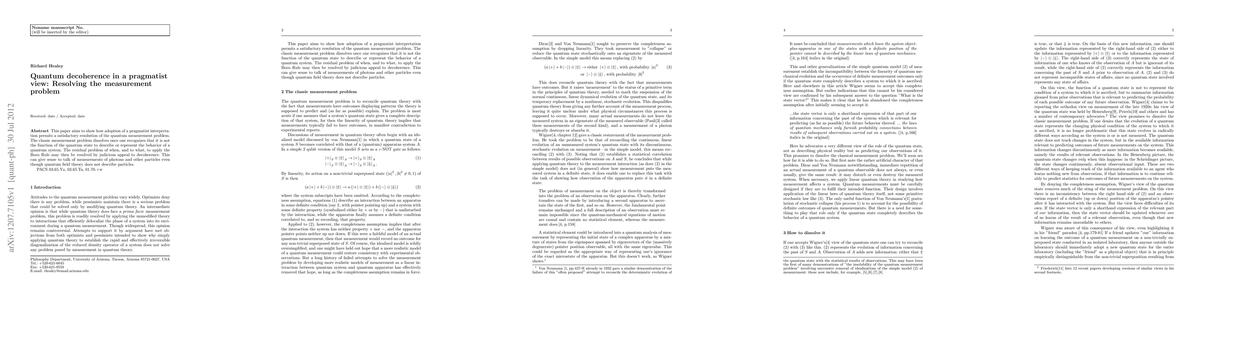 The paper provides a novel solution to the quantum measurement problem using a pragmatist interpretation and decoherence.
