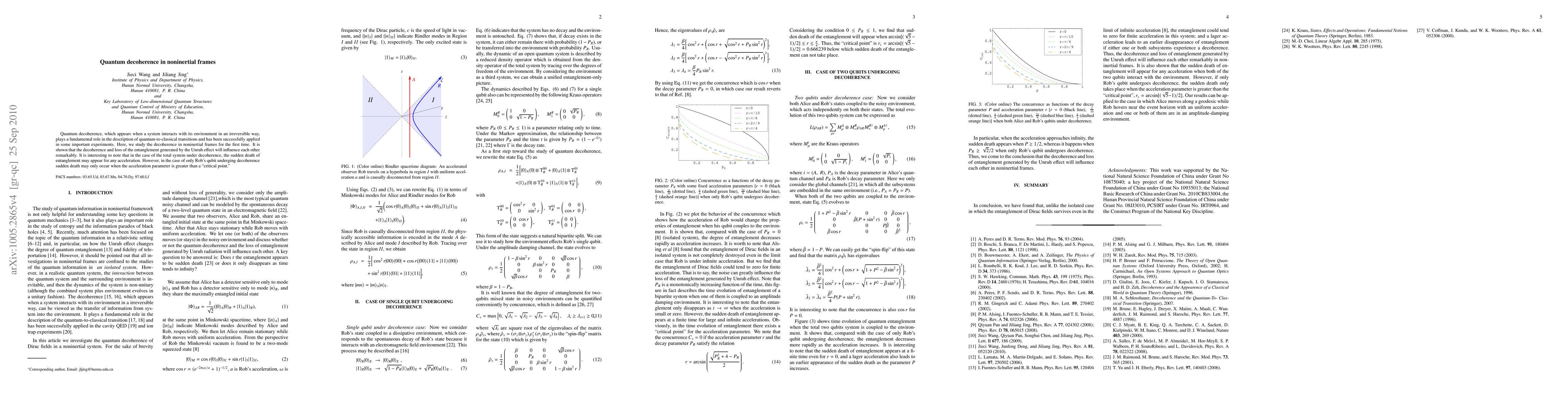 **Summary:** This paper investigates quantum decoherence in noninertial frames, demonstrating that decoherence and entanglement loss due to the Unruh effect interact significantly. It finds that while sudden death of entanglement can occur for any acceleration in the total system, it only happens above a critical acceleration threshold for a qubit undergoing decoherence alone.