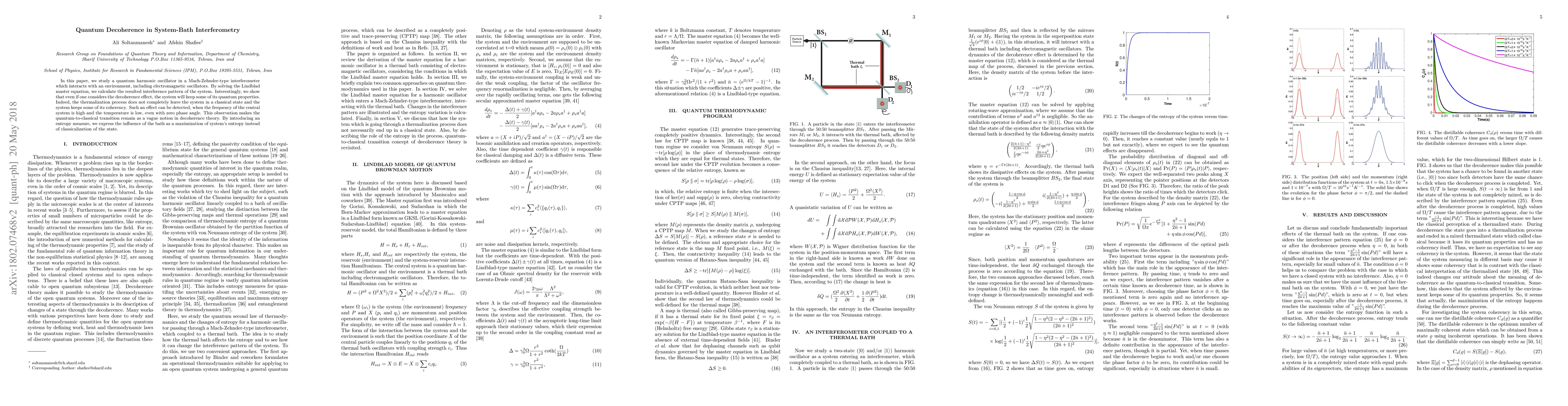 In this paper, we study a quantum harmonic oscillator in a Mach-Zehnder-type interferometer which interacts with an environment, including electromagnetic oscillators. By solving the Lindblad master equation, we calculate the resulted interference pattern of the system. Interestingly, we show that even if one considers the decoherence effect, the system will keep some of its quantum properties. Indeed, the thermalization process does not completely leave the system in a classical state and the system keeps some of its coherency. Such an effect can be detected, when the frequency of the central system is high and the temperature is low, even with zero phase angle. This observation makes the quantum-to-classical transition remain as a vague notion in decoherence theory. By introducing an entropy measure, we express the influence of the bath as a maximization of system's entropy instead of classicalization of the state.
