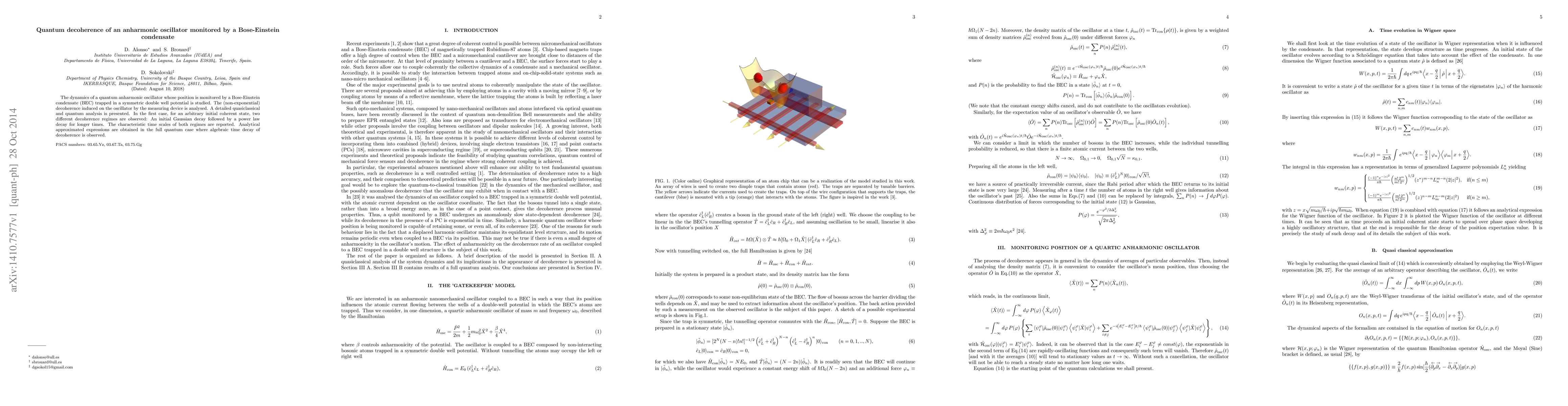 This paper investigates the quantum decoherence of an anharmonic oscillator monitored by a Bose-Einstein condensate, revealing two distinct decoherence regimes: an initial Gaussian decay followed by a power law decay, and an algebraic time decay in the full quantum case. Analytical expressions for the characteristic time scales and decoherence behavior are provided.