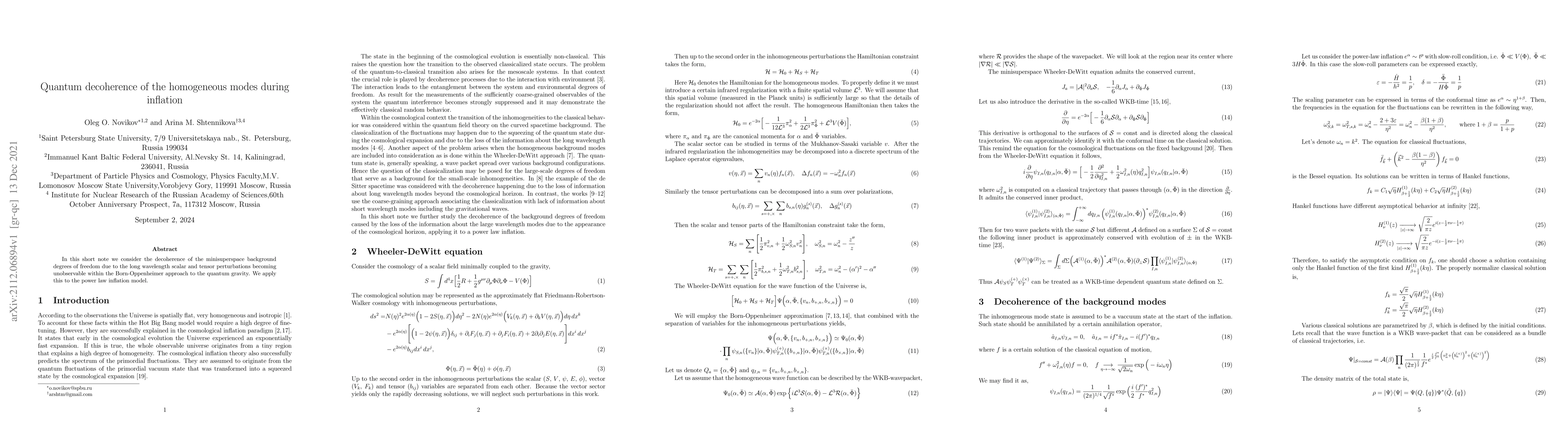 Summary: This paper explores quantum decoherence of homogeneous modes during inflation, focusing on how long wavelength perturbations become unobservable through the Born-Oppenheimer approach in quantum gravity, specifically applied to a power law inflation model.