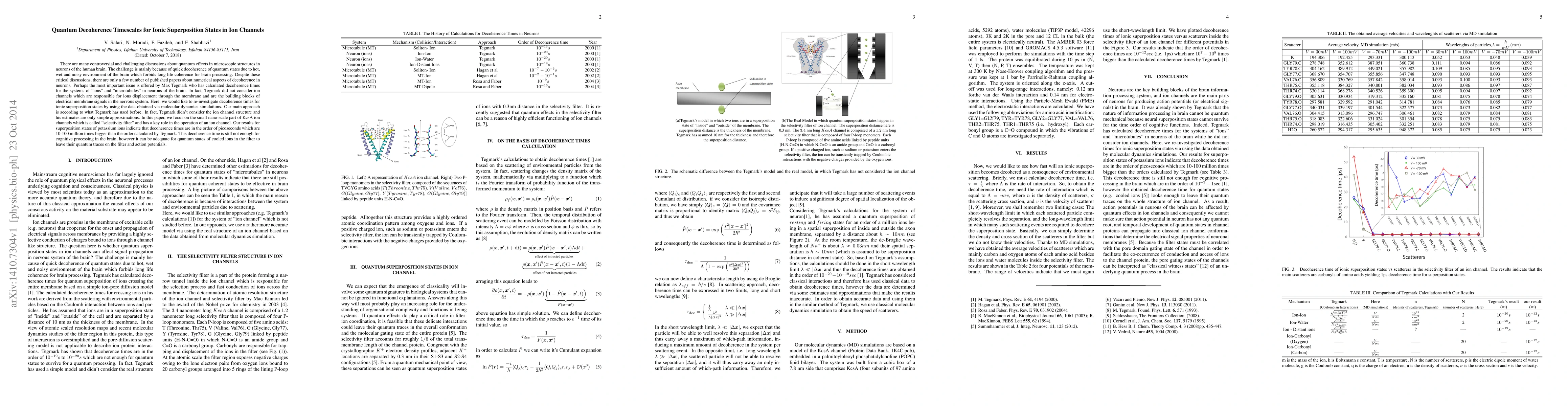 There are many controversial and challenging discussions about quantum effects in microscopic structures in neurons of the human brain. The challenge is mainly because of quick decoherence of quantum states due to hot, wet and noisy environment of the brain which forbids long life coherence for brain processing. Despite these critical discussions, there are only a few number of published papers about numerical aspects of decoherence in neurons. Perhaps the most important issue is offered by Max Tegmark who has calculated decoherence times for the systems of "ions" and "microtubules" in neurons of the brain. In fact, Tegmark did not consider ion channels which are responsible for ions displacement through the membrane and are the building blocks of electrical membrane signals in the nervous system. Here, we would like to re-investigate decoherence times for ionic superposition states by using the data obtained via molecular dynamics simulations. Our main approach is according to what Tegmark has used before. In fact, Tegmark didn't consider the ion channel structure and his estimates are only simple approximations. In this paper, we focus on the small nano-scale part of KcsA ion channels which is called "selectivity filter" and has a key role in the operation of an ion channel. Our results for superposition states of potassium ions indicate that decoherence times are in the order of picoseconds which are 10-100 million times bigger than the order calculated by Tegmark. This decoherence time is still not enough for cognitive processing in the brain, however it can be adequate for quantum states of cooled ions in the filter to leave their quantum traces on the filter and action potentials.