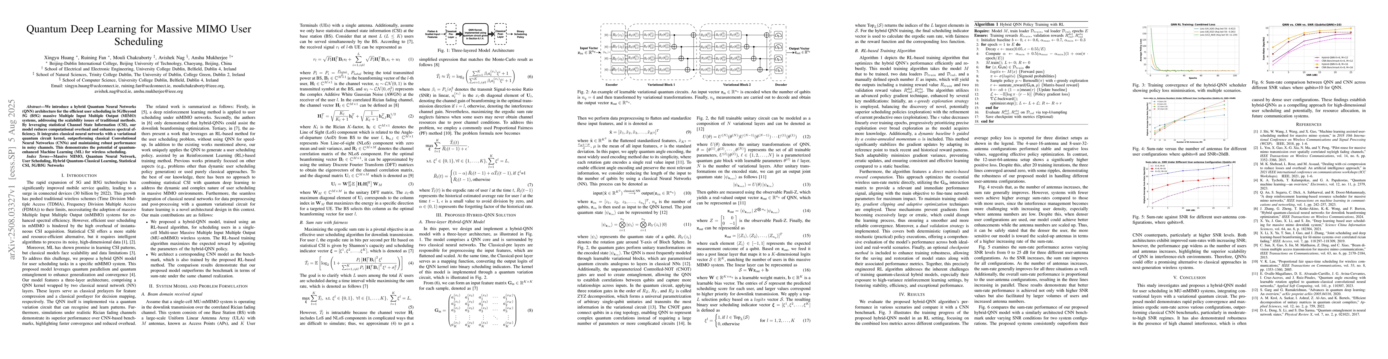 We introduce a hybrid Quantum Neural Networks (QNN) architecture for the efficient user scheduling in 5G/Beyond 5G (B5G) massive Multiple Input Multiple Output (MIMO) systems, addressing the scalability issues of traditional methods. By leveraging statistical Channel State Information (CSI), our model reduces computational overhead and enhances spectral efficiency. It integrates classical neural networks with a variational quantum circuit kernel, outperforming classical Convolutional Neural Networks (CNNs) and maintaining robust performance in noisy channels. This demonstrates the potential of quantum-enhanced Machine Learning (ML) for wireless scheduling.