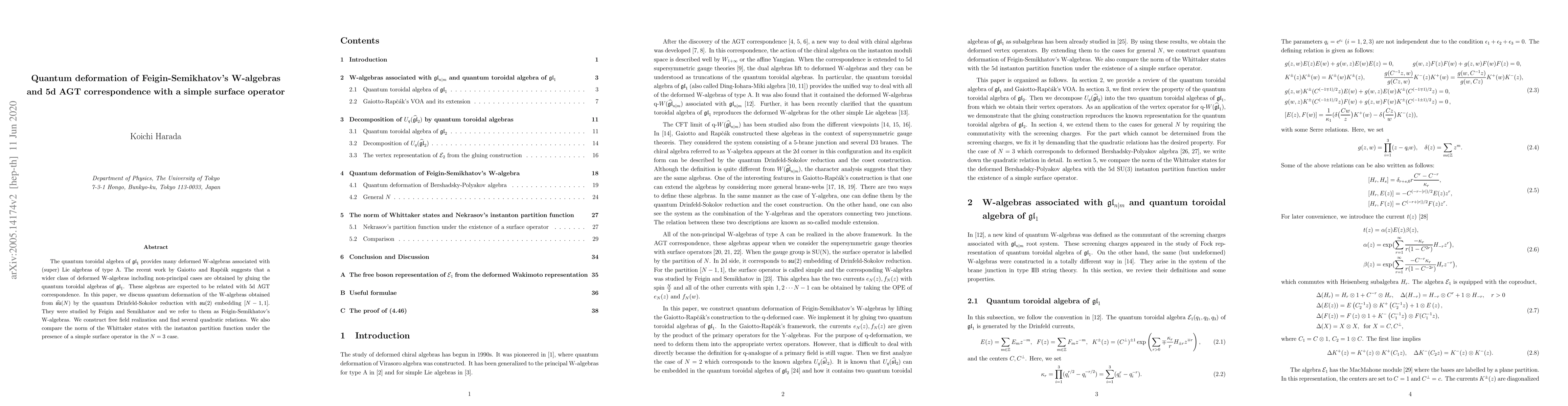 The quantum toroidal algebra of $gl_1$ provides many deformed W-algebras associated with (super) Lie algebras of type A. The recent work by Gaiotto and Rapcak suggests that a wider class of deformed W-algebras including non-principal cases are obtained by gluing the quantum toroidal algebras of $gl_1$. These algebras are expected to be related with 5d AGT correspondence. In this paper, we discuss quantum deformation of the W-algebras obtained from $\widehat{su}(N)$ by the quantum Drinfeld-Sokolov reduction with su(2) embedding [N-1,1]. They were studied by Feigin and Semikhatov and we refer to them as Feigin-Semikhatov's W-algebras. We construct free field realization and find several quadratic relations. We also compare the norm of the Whittaker states with the instanton partition function under the presence of a simple surface operator in the N=3 case.