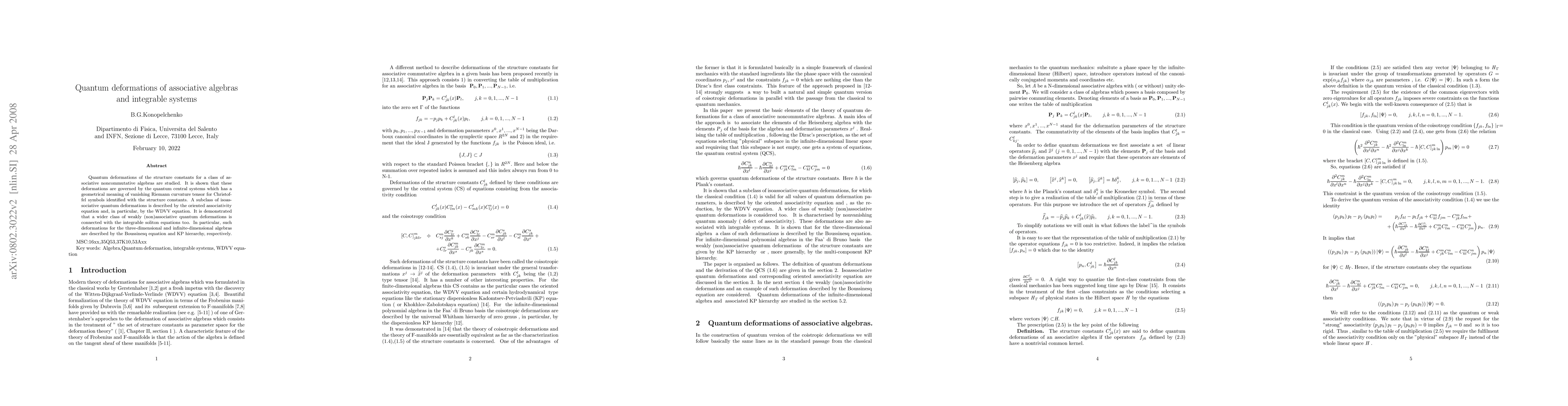 This paper explores quantum deformations of associative noncommutative algebras and their connection to integrable systems. It reveals that these deformations are influenced by quantum central systems and linked to vanishing Riemann curvature tensors, with specific deformations governed by the WDVV equation and broader deformations associated with integrable soliton equations like the Boussinesq equation and KP hierarchy.