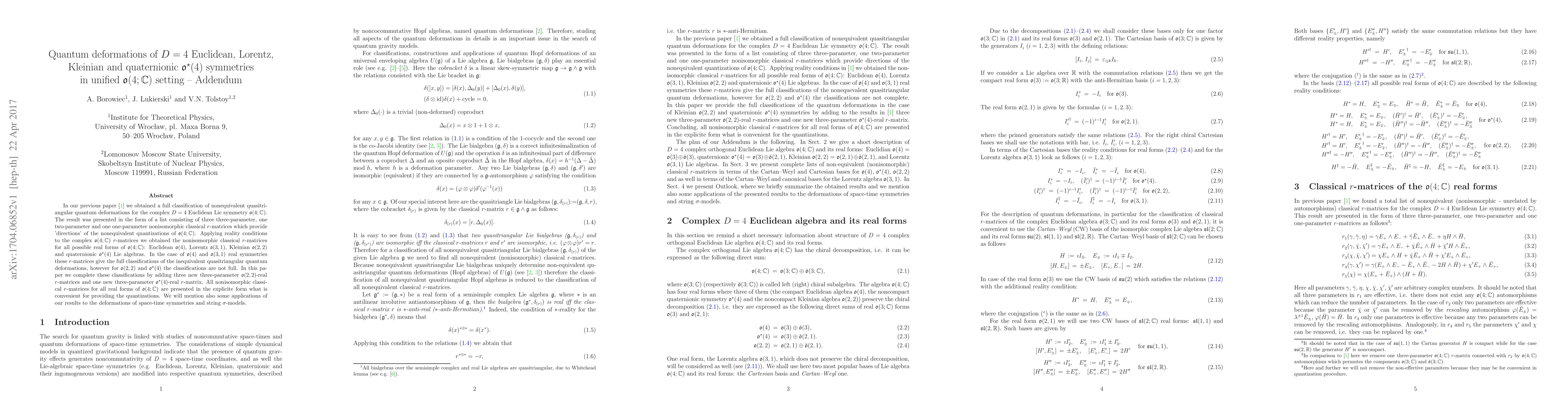 This paper completes the classification of quasitriangular quantum deformations for real forms of the complex $D=4$ Euclidean Lie algebra $\mathfrak{o}(4;\mathbb{C})$, providing explicit nonisomorphic classical $r$-matrices for $\mathfrak{o}(4)$, $\mathfrak{o}(3,1)$, $\mathfrak{o}(2,2)$, and $\mathfrak{o}^{\star}(4)$. It also discusses applications to space-time symmetries and string theory.