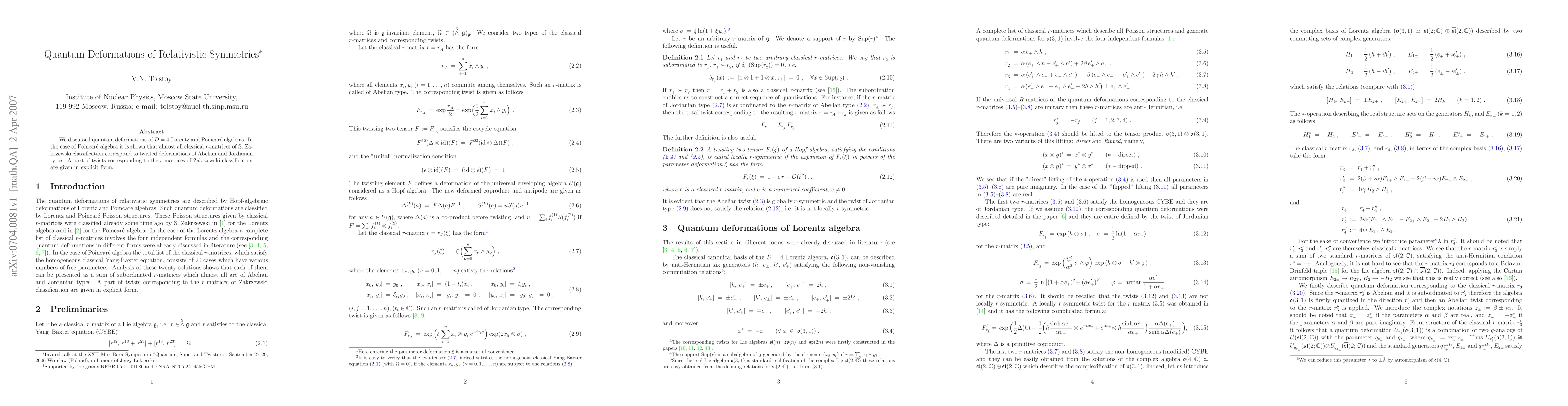 We discussed quantum deformations of D=4 Lorentz and Poincare algebras. In the case of Poincare algebra it is shown that almost all classical r-matrices of S. Zakrzewski classification correspond to twisted deformations of Abelian and Jordanian types. A part of twists corresponding to the r-matrices of Zakrzewski classification are given in explicit form.