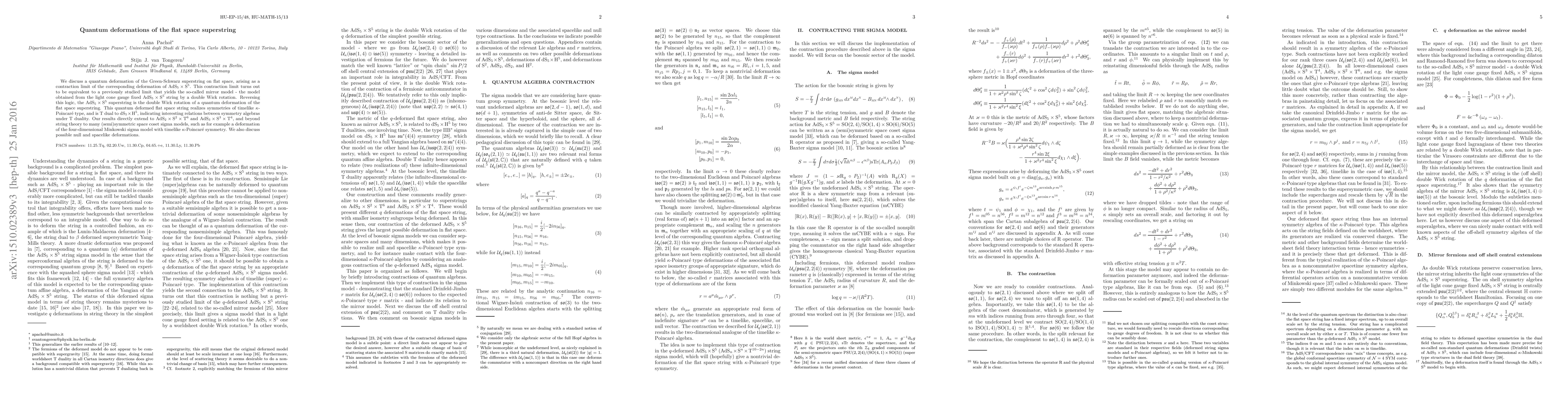 We discuss a quantum deformation of the Green-Schwarz superstring on flat space, arising as a contraction limit of the corresponding deformation of AdS_5 x S^5. This contraction limit turns out to be equivalent to a previously studied limit that yields the so-called mirror model - the model obtained from the light cone gauge fixed AdS_5 x S^5 string by a double Wick rotation. Reversing this logic, the AdS_5 x S^5 superstring is the double Wick rotation of a quantum deformation of the flat space superstring. This quantum deformed flat space string realizes symmetries of timelike kappa-Poincare type, and is T dual to dS_5 x H^5, indicating interesting relations between symmetry algebras under T duality. Our results directly extend to AdS_2 x S^2 x T^6 and AdS_3 x S^3 x T^4, and beyond string theory to many (semi)symmetric space coset sigma models, such as for example a deformation of the four dimensional Minkowski sigma model with timelike kappa-Poincare symmetry. We also discuss possible null and spacelike deformations.