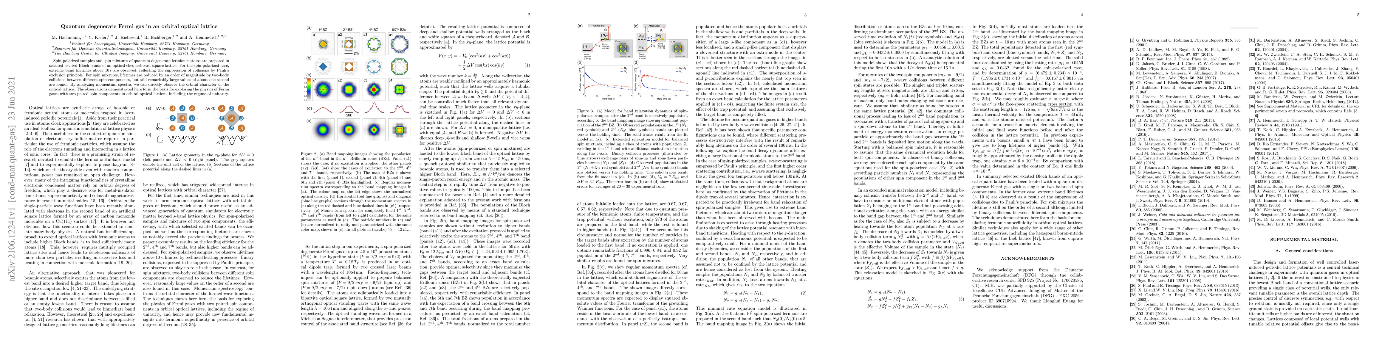 This paper investigates quantum degenerate Fermi gases in an orbital optical lattice, observing long lifetimes for spin-polarized samples due to collision suppression, and slightly reduced but still significant lifetimes for spin mixtures due to two-body collisions. Momentum spectra reveal the orbital nature of the lattice, laying the groundwork for studying Fermi gases in unitarity regimes.