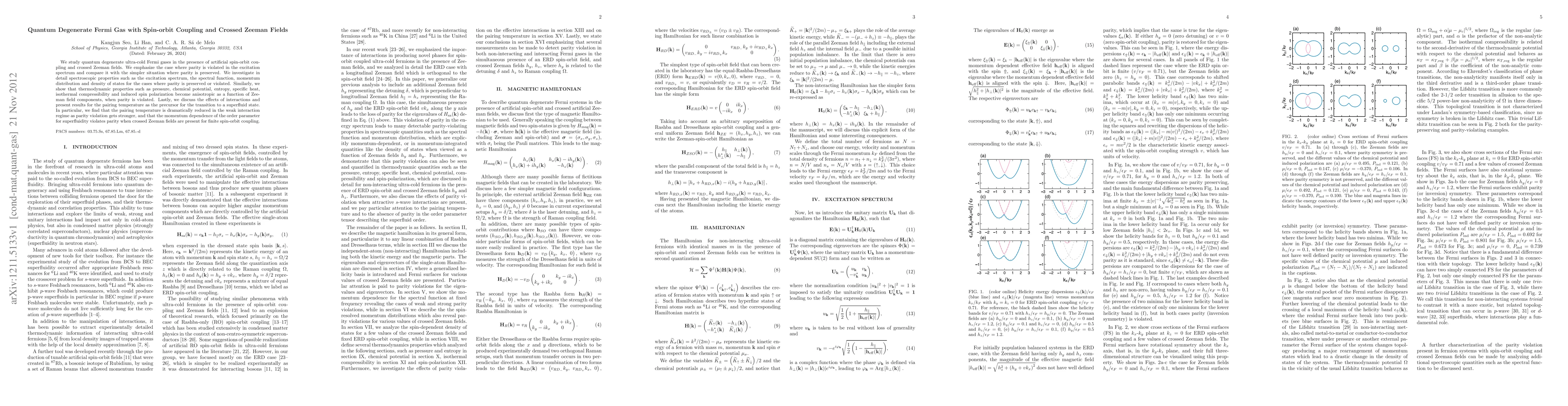 This paper investigates quantum degenerate Fermi gases with spin-orbit coupling and crossed Zeeman fields, focusing on the effects of parity violation on spectroscopic and thermodynamic properties. It finds that parity violation leads to anisotropic thermodynamic properties and significantly reduces the pairing temperature for superfluidity.