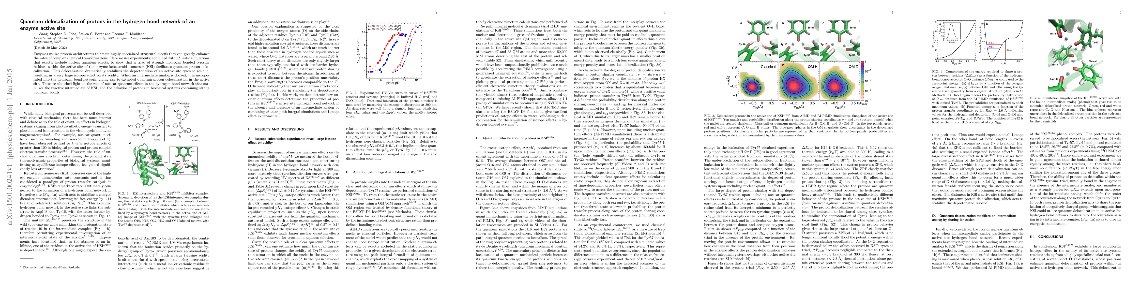 This paper demonstrates that a triad of tyrosine residues in the enzyme ketosteroid isomerase facilitates quantum proton delocalization, significantly stabilizing the deprotonation of an active site tyrosine and producing a large isotope effect. The findings highlight the role of nuclear quantum effects in stabilizing reactive intermediates in enzyme active sites.