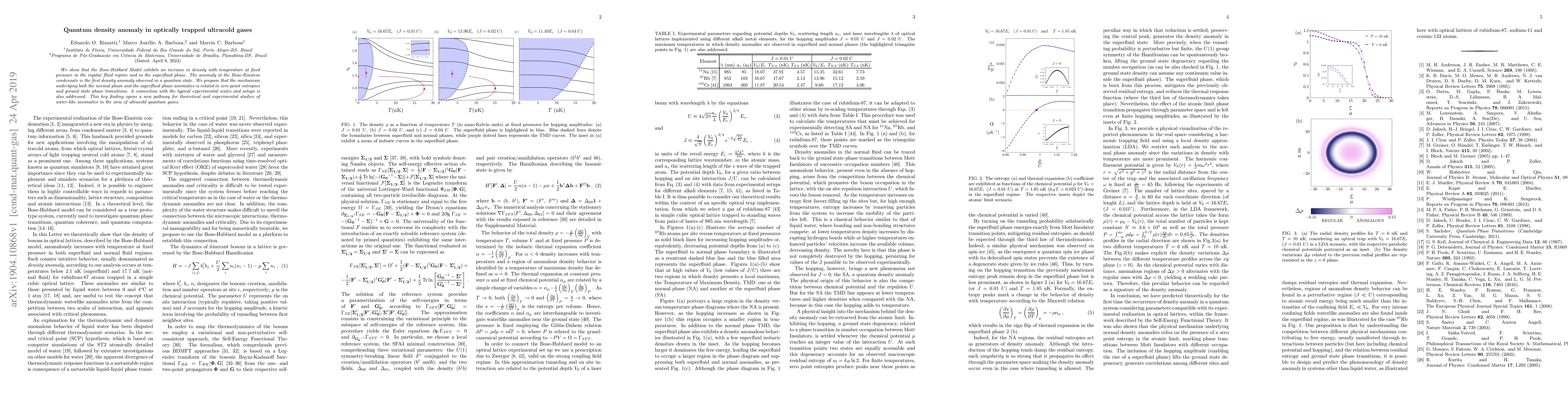 We show that the Bose-Hubbard Model exhibits an increase in density with temperature at fixed pressure in the regular fluid regime and in the superfluid phase. The anomaly at the Bose-Einstein condensate is the first density anomaly observed in a quantum state. We propose that the mechanism underlying both the normal phase and the superfluid phase anomalies is related to zero point entropies and ground state phase transitions. A connection with the typical experimental scales and setups is also addressed. This key finding opens a new pathway for theoretical and experimental studies of water-like anomalies in the area of ultracold quantum gases.