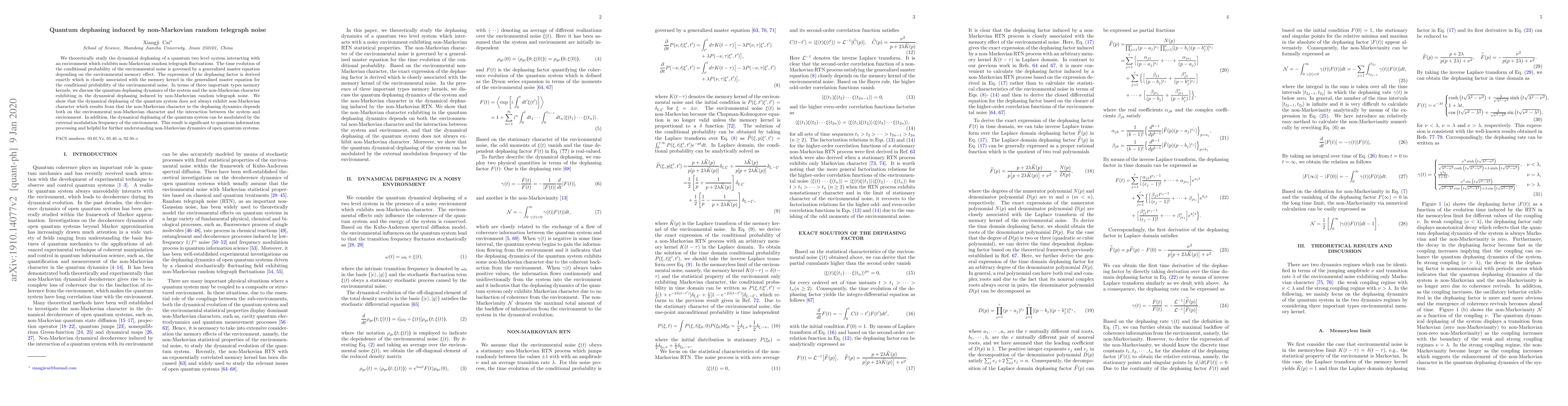 Derivation of the exact expression for the dephasing factor induced by non-Markovian random telegraph noise, and analysis of its dependence on environmental memory effects and system-environment interaction.