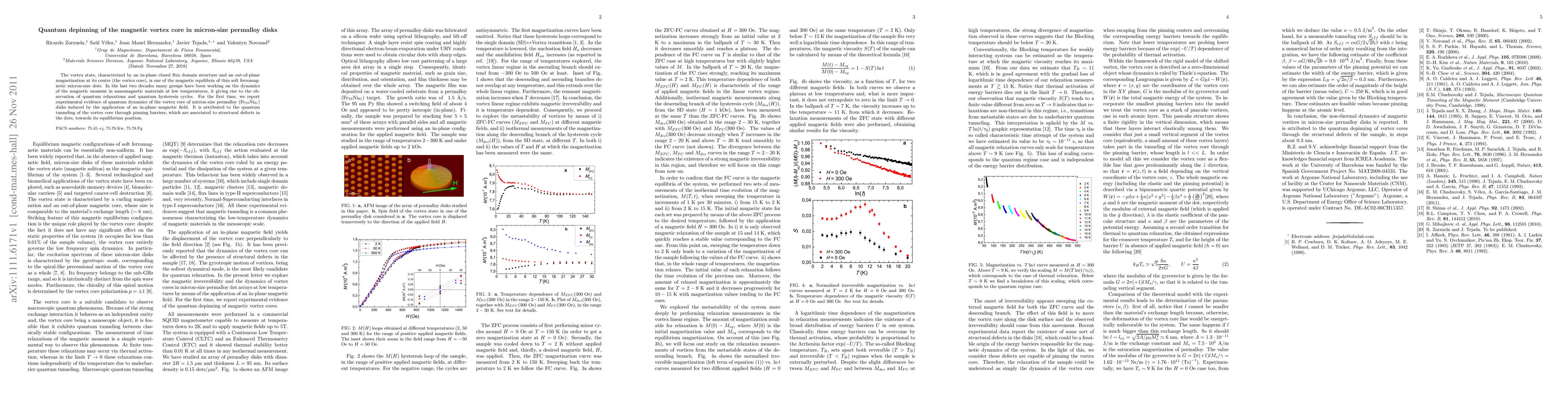 This paper reports experimental evidence of quantum dynamics in the vortex core of micron-size permalloy disks under an in-plane magnetic field, revealing quantum tunneling through pinning barriers due to structural defects. This phenomenon is observed as the vortex core moves towards its equilibrium position.