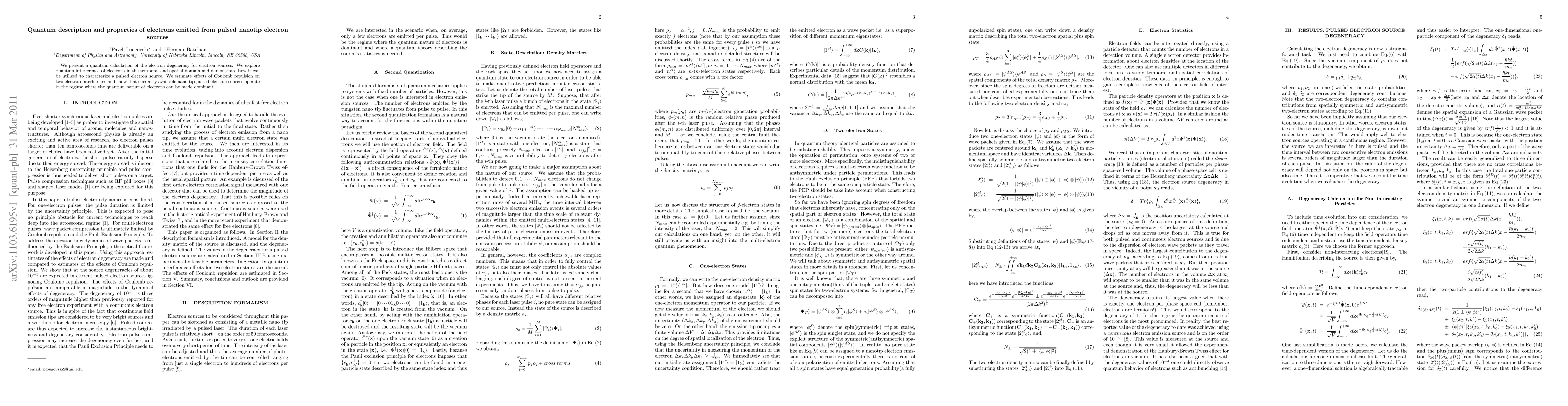 The paper introduces a formalism for describing both pulsed and continuous nanotip electron emission sources, calculating the quantum degeneracy of pulsed sources, and exploring electron-electron interference effects.