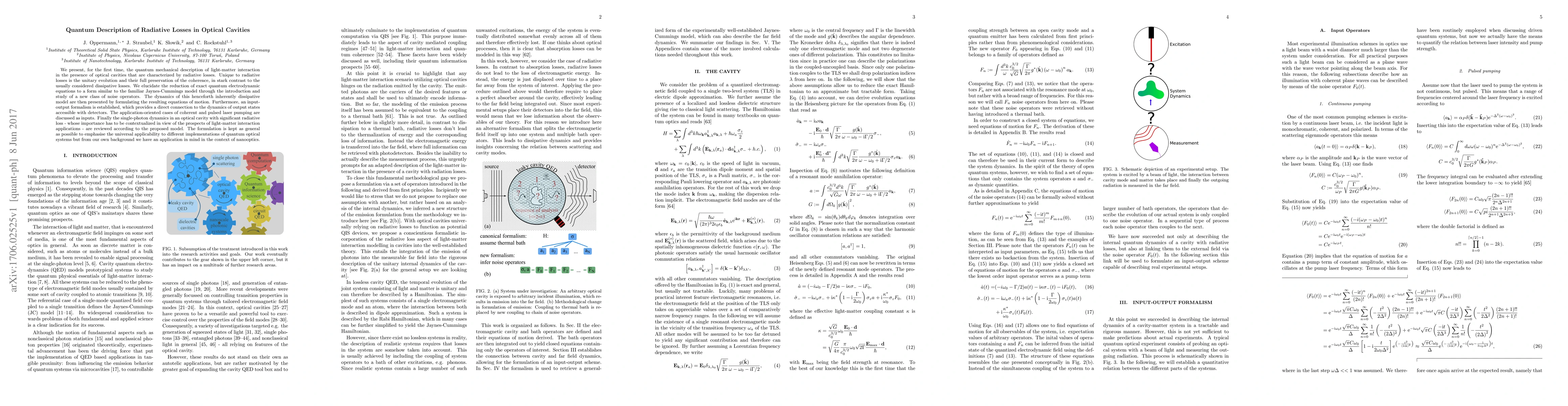 We present, for the first time, the quantum mechanical description of light-matter interaction in the presence of optical cavities that are characterized by radiative losses. Unique to radiative losses is the unitary evolution and their full preservation of the coherence, in stark contrast to the usually considered dissipative losses. We elucidate the reduction of exact quantum electrodynamic equations to a form similar to the familiar Jaynes-Cummings model through the introduction and study of a new class of noise operators. The dynamics of this henceforth inherently dissipative model are then presented by formulating the resulting equations of motion. Furthermore, an input- output formalism is established, which provides a direct connection to the dynamics of output states accessible with detectors. The application-oriented cases of coherent and pulsed laser pumping are discussed as inputs. Finally the single-photon dynamics in an optical cavity with significant radiative loss - whose importance has to be contextualized in view of the prospects of light-matter interaction applications - are reviewed according to the proposed model. The formulation is kept as general as possible to emphasise the universal applicability to different implementations of quantum optical systems but from our own background we have an application in mind in the context of nanooptics.
