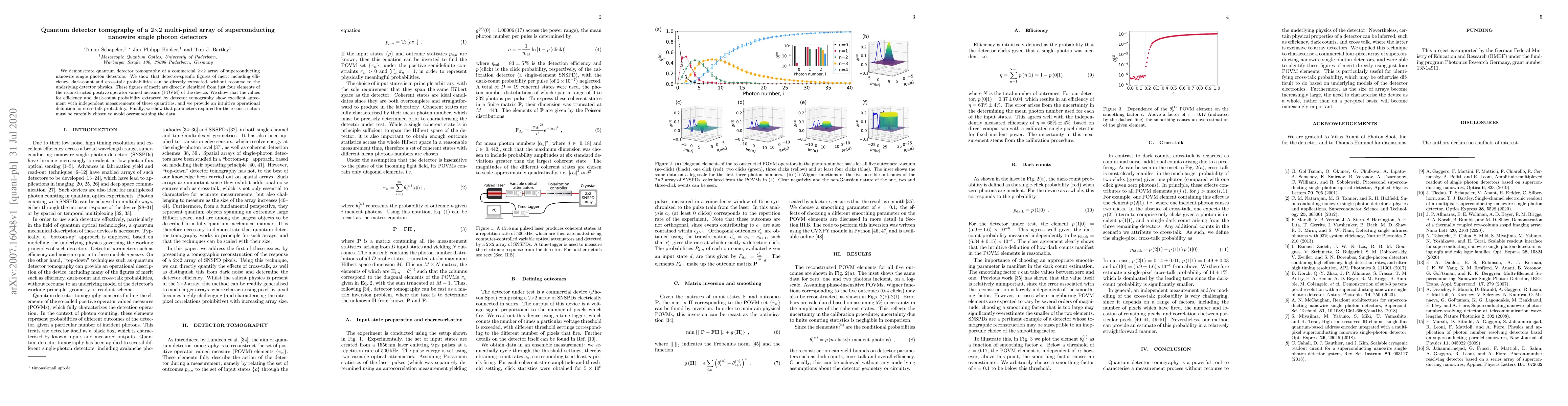 Researchers successfully applied quantum detector tomography to a 2x2 array of superconducting nanowire single photon detectors, extracting efficiency, dark-count, and cross-talk probabilities with high accuracy.